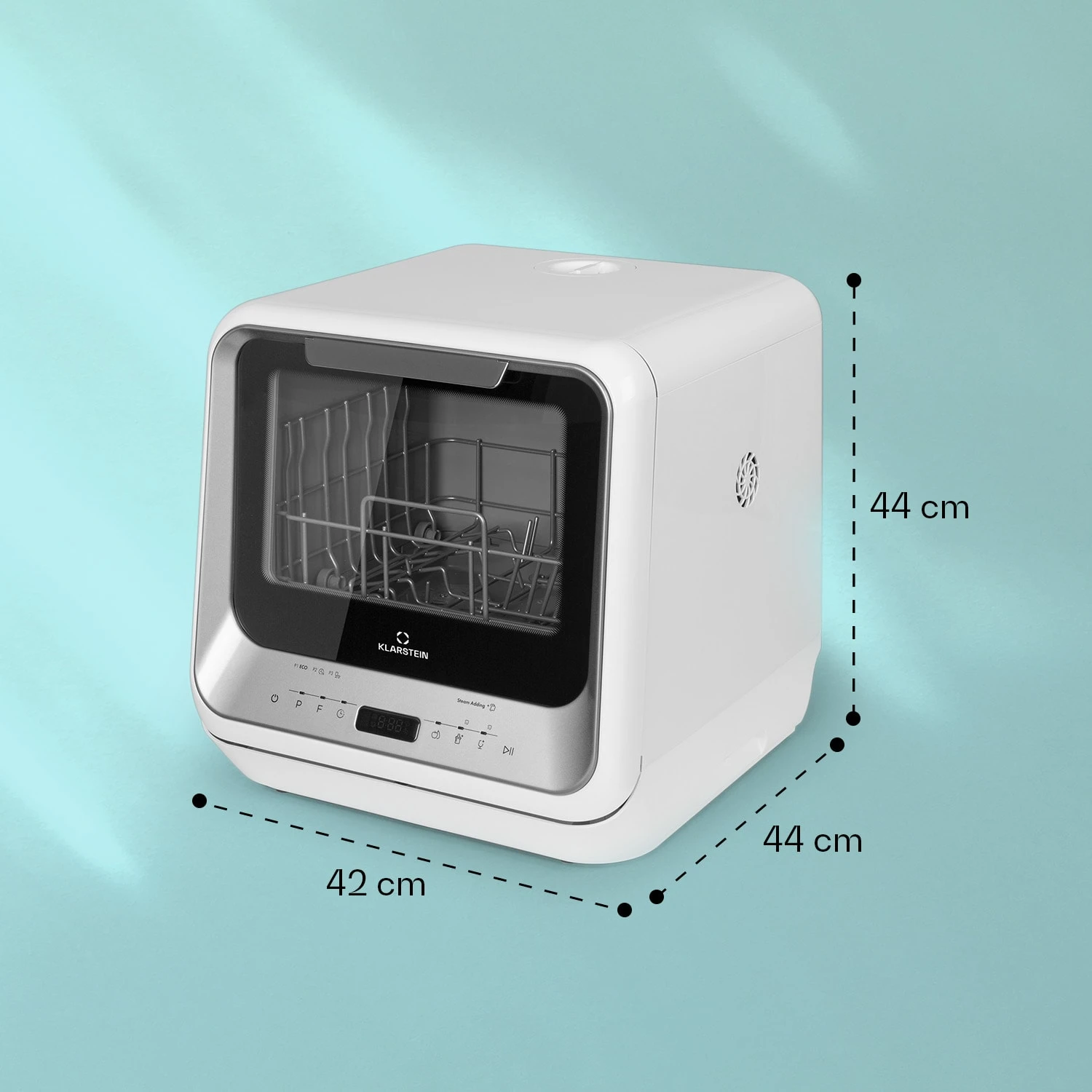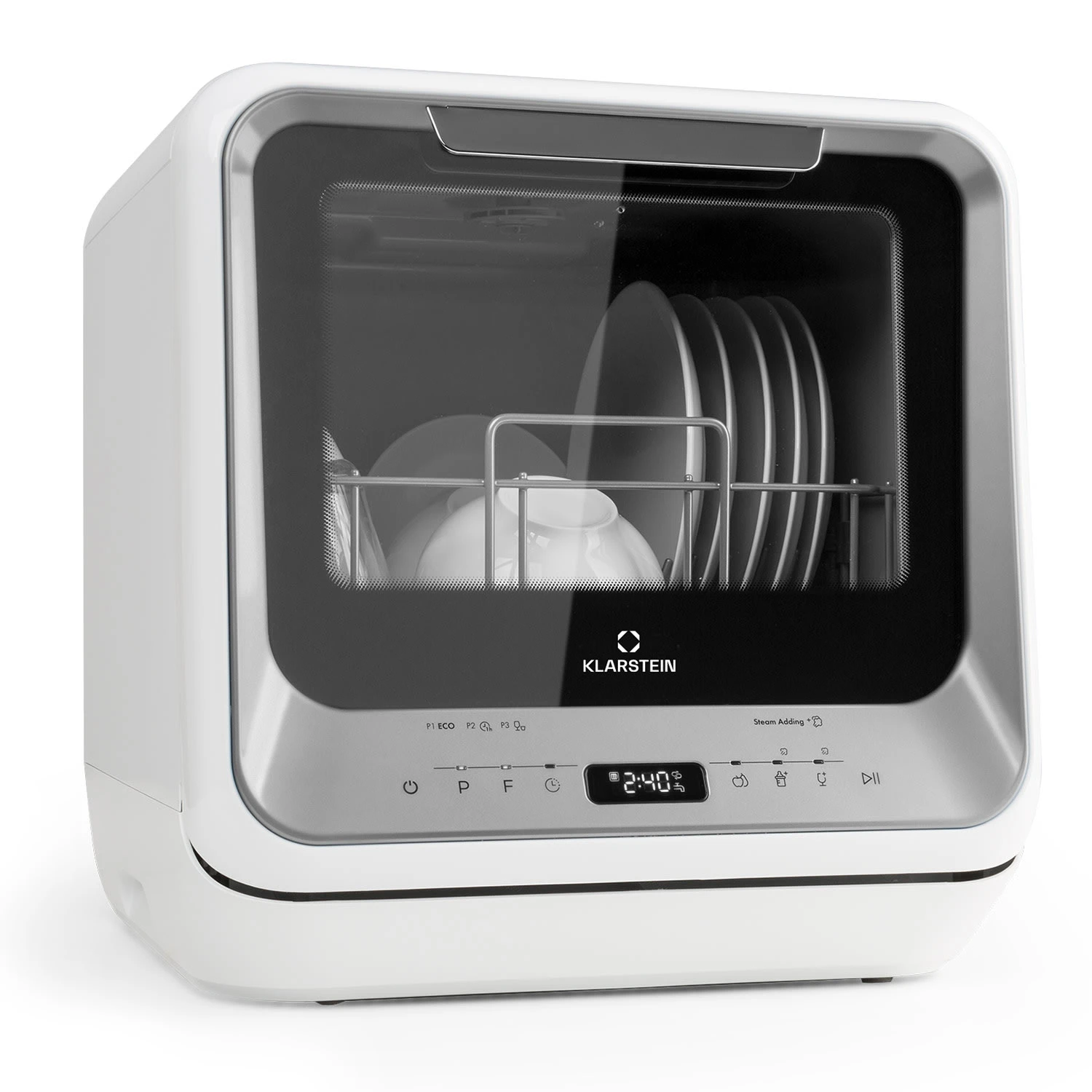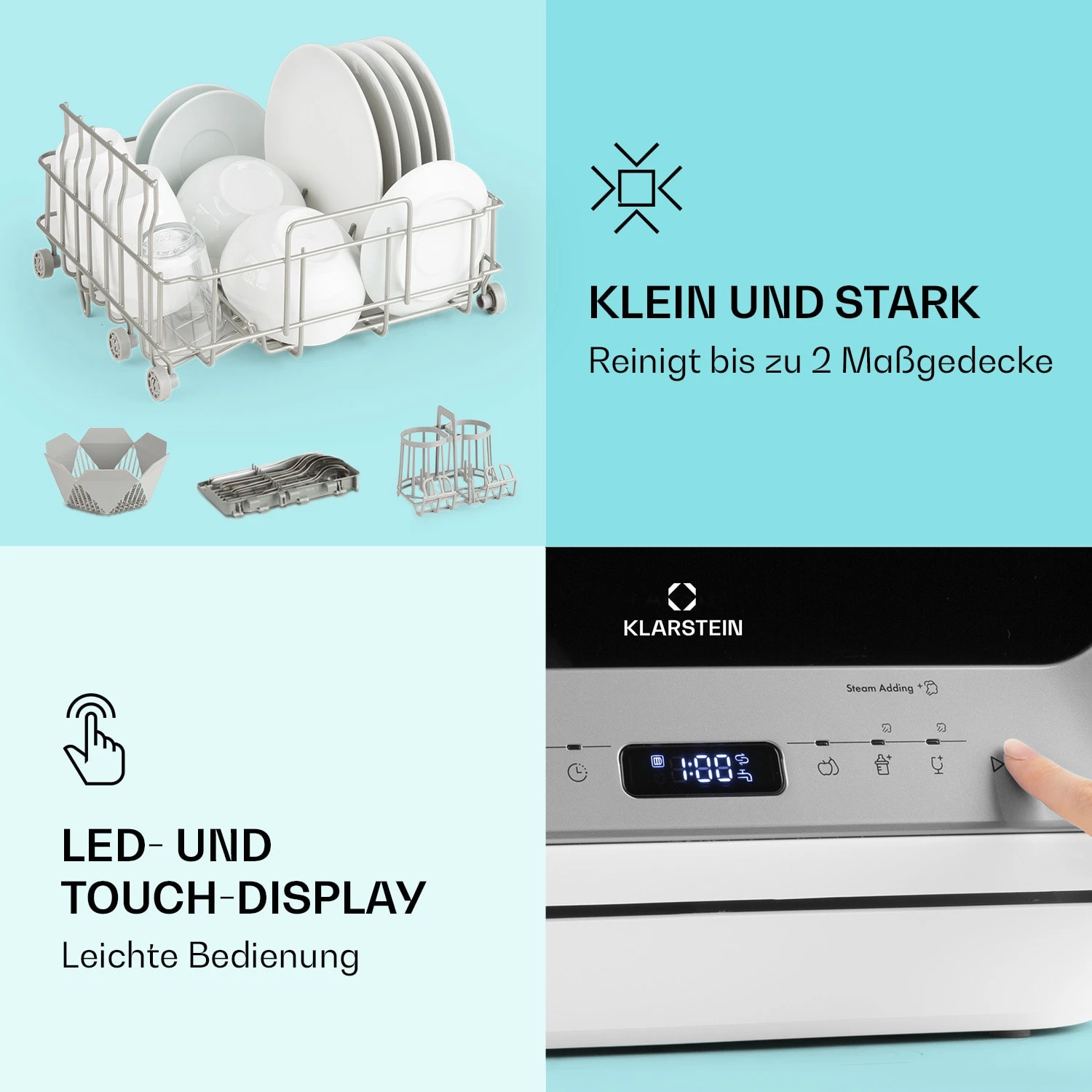 Der Klarstein Amazonia Mini-Geschirrspüler ist die perfekte Spülhilfe für Single-Küchen, Ferienwohnungen oder Camping! Bis zu zwei Maßgedecke finden in ihm Platz und werden innerhalb kürzester Zeit wieder blitzblank für die nächste Mahlzeit. Über das LED-Display kannst du einfach und bequem zwischen 6 effizienten Spülprogrammen wählen.