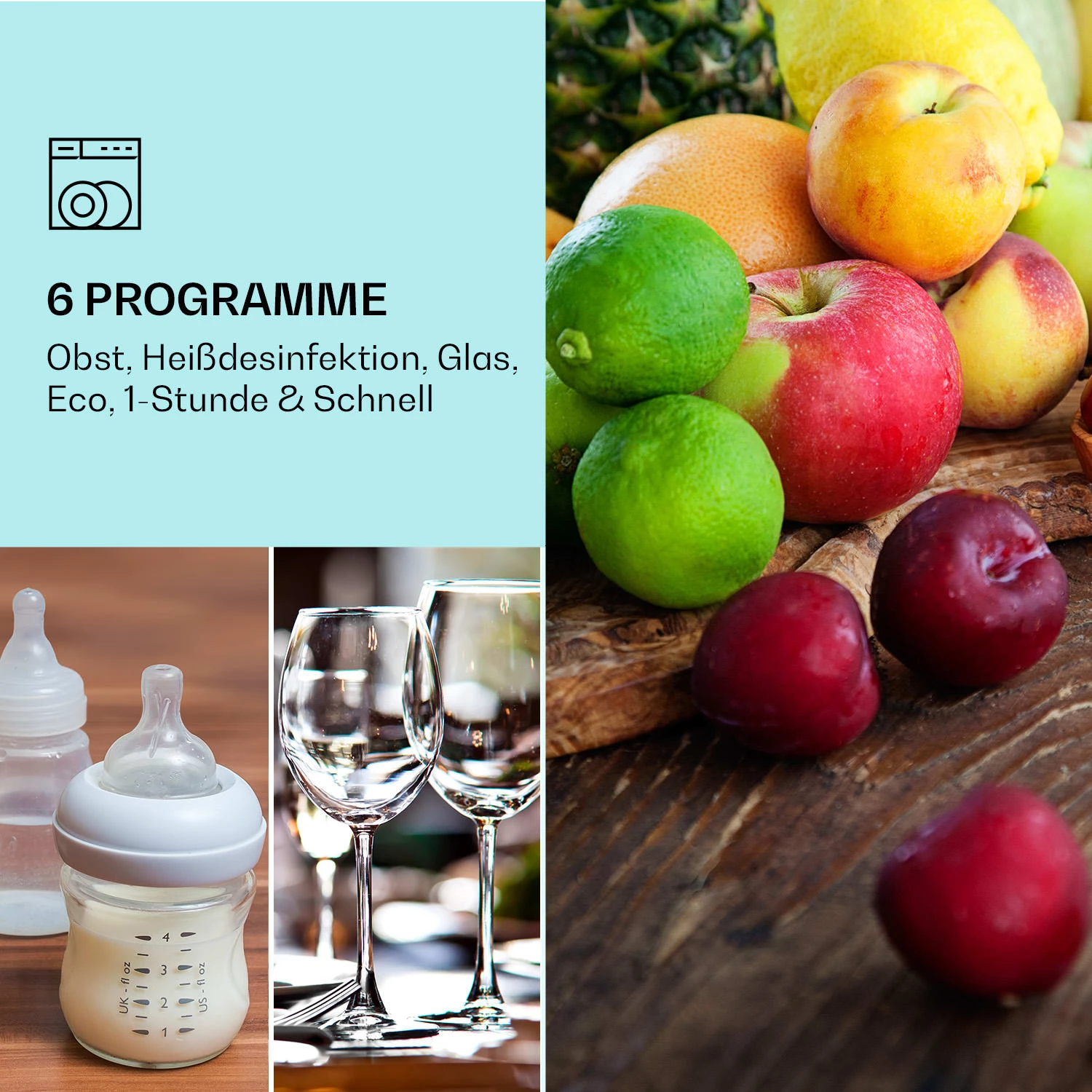 - 6 Programme: Obst, Heißdesinfektion, Eco, Glas 1-Stunde, Schnell