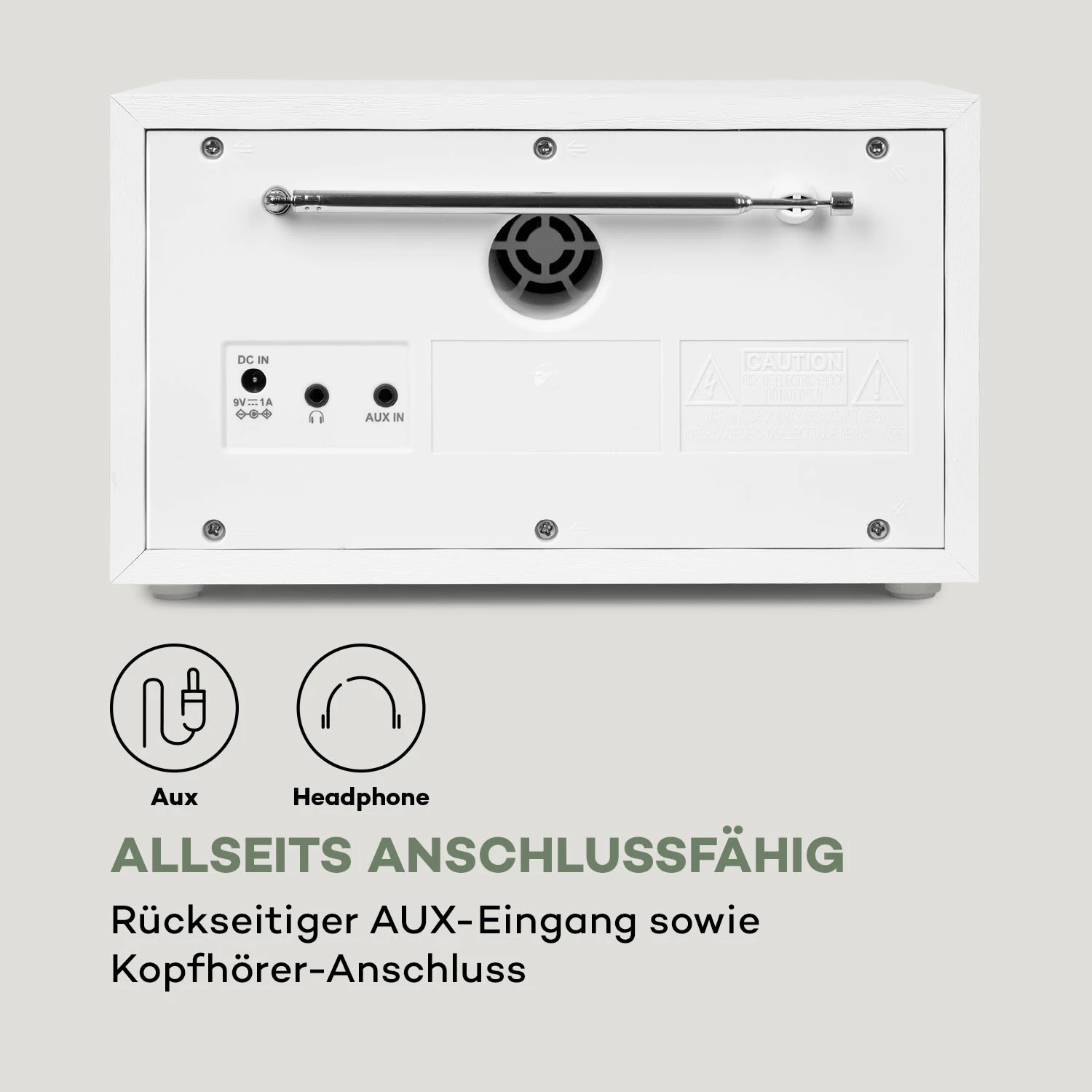 Wer gerade keine Lust auf Radio hat, der kann auf zahlreiche weitere Medienquellen zugreifen. Die Bluetooth 5.0 Schnittstelle mit A2DP-Unterstützung empfängt kabellos Musik von MP3-Playern, Smartphones und zahlreichen BT-fähigen Geräten. Über den rückseitigen AUX-Eingang können auch ganz konventionell externe Geräte Zugang finden. Besonders praktisch erweist sich das auna Ambient Radio in der Küche oder im Schlafzimmer. Die integrierte Uhr verfügt nicht nur über eine Eieruhr-Funktion, sondern auch einen Sleeptimer zur automatischen Abschaltung und einen Wecker mit zwei programmierbaren Alarmzeiten.