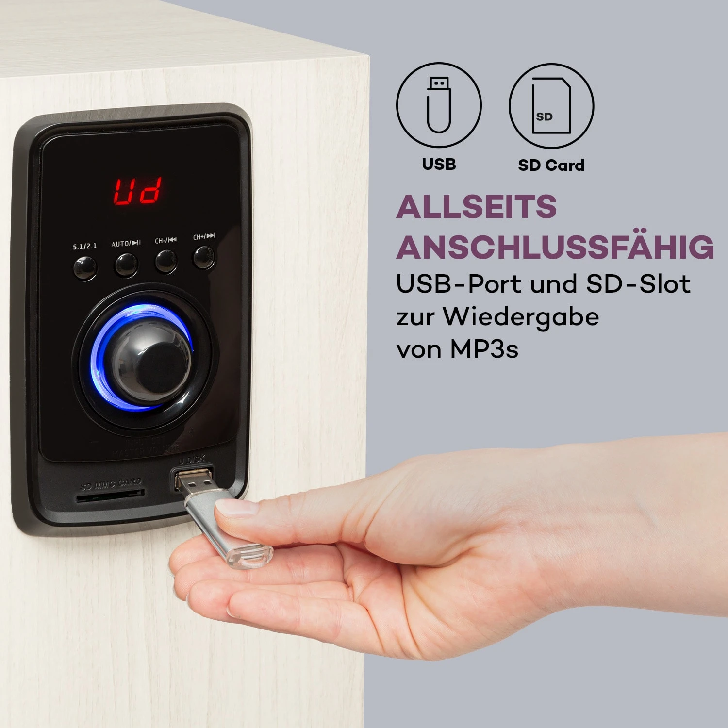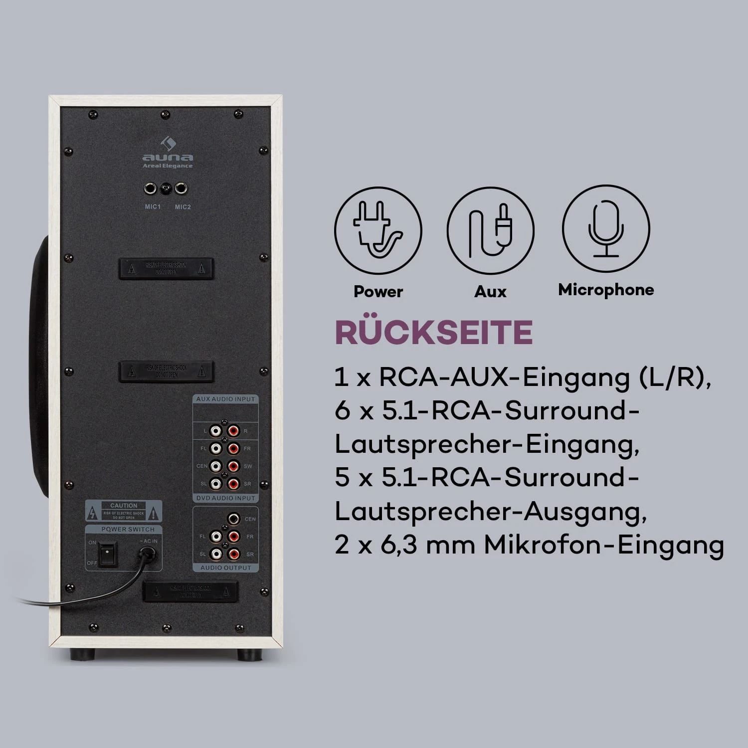 Technischer Mittelpunkt des Heimkinosystems ist der aktive Subwoofer, der die fünf Satellitenlautsprecher dirigiert und antreibt. Der 5″ Bassreflex-Subwoofer erzeugt im Zusammenspiel mit den Lautsprechern, bestehend aus vier Stands und einem Center, einen runden, raumfüllenden Gesamtklang mit 190 Watt RMS Gesamtleistung. Äußerst verbindungsfreudig bezieht die auna Elegance 5.1-Anlage dabei ihren Sound aus den verschiedensten Quellen: Durch die frontseitig verbauten USB- und SD-Ports kommuniziert die Surround-Anlage mit portablen Datenträgern wie USB-Sticks und SD-Karten für den unkomplizierten Zugriff auf MP3-Titel. Die Bluetooth-Schnittstelle ermöglicht zudem drahtloses Streaming via Smartphone, Tablet oder Laptop. Über den rückseitigen AUX-Eingang können zusätzlich Audiokomponenten aller Art, wie Computer, CD- & MP3-Player, mit dem auna Areal Elegance verbunden werden. Auch zwei kabelgebundene Mikrofone finden mit zwei 6,3 mm großen Eingängen an der Rückseite des Subwoofers ihren Anschlussort. Die Lautsprecherverkettung der Satteliten erfolgt per Lautsprecherklemmen und geht kinderleicht von der Hand, während sich Menüs und Klangeinstellung über die mitgelieferte Fernbedienung anpassen lassen. Auch optisch überzeugt das auna Areal Elegance Surround-System auf ganzer Linie und fügt sich dank elegantem Gesamtdesign in heller Holzoptik ideal in jedes Wohnzimmerambiente ein.