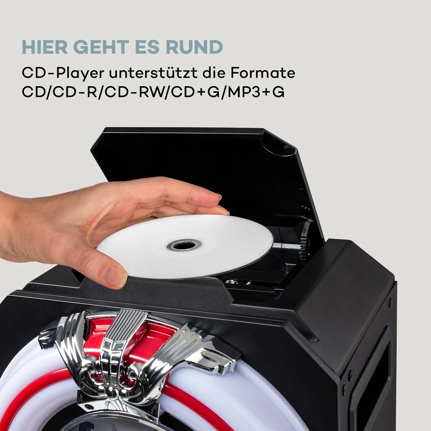 Die auna Arizona Jukebox verfügt über einen MP3-fähigen USB-Port zum einfachen Abspielen und Aufzeichnen von Musik-Titeln. Das besondere Highlight sind neben der integrierten Bluetooth-Funktion, die ein drahtloses Streamen des Audiosignals erlaubt, auch das mitgelieferte Kabelmikrofon sowie die beiden rückseitigen Mikrofon-Eingänge. Somit steht spontanen Singeinlagen und ausgelassenen Karaoke-Abenden nichts mehr im Wege. Ein echter Hingucker ist außerdem der stilvoll eingelassene Toploader-CD-Player, der neben den herkömmlichen Formaten, wie CD/CD-R/CD-RW/ auch CD+G und MP3+G mit integrierter Textanzeige liest. Zur bequemen Verwendung empfiehlt sich hierbei, die Arizona Sing an einen Fernseher anzuschließen.