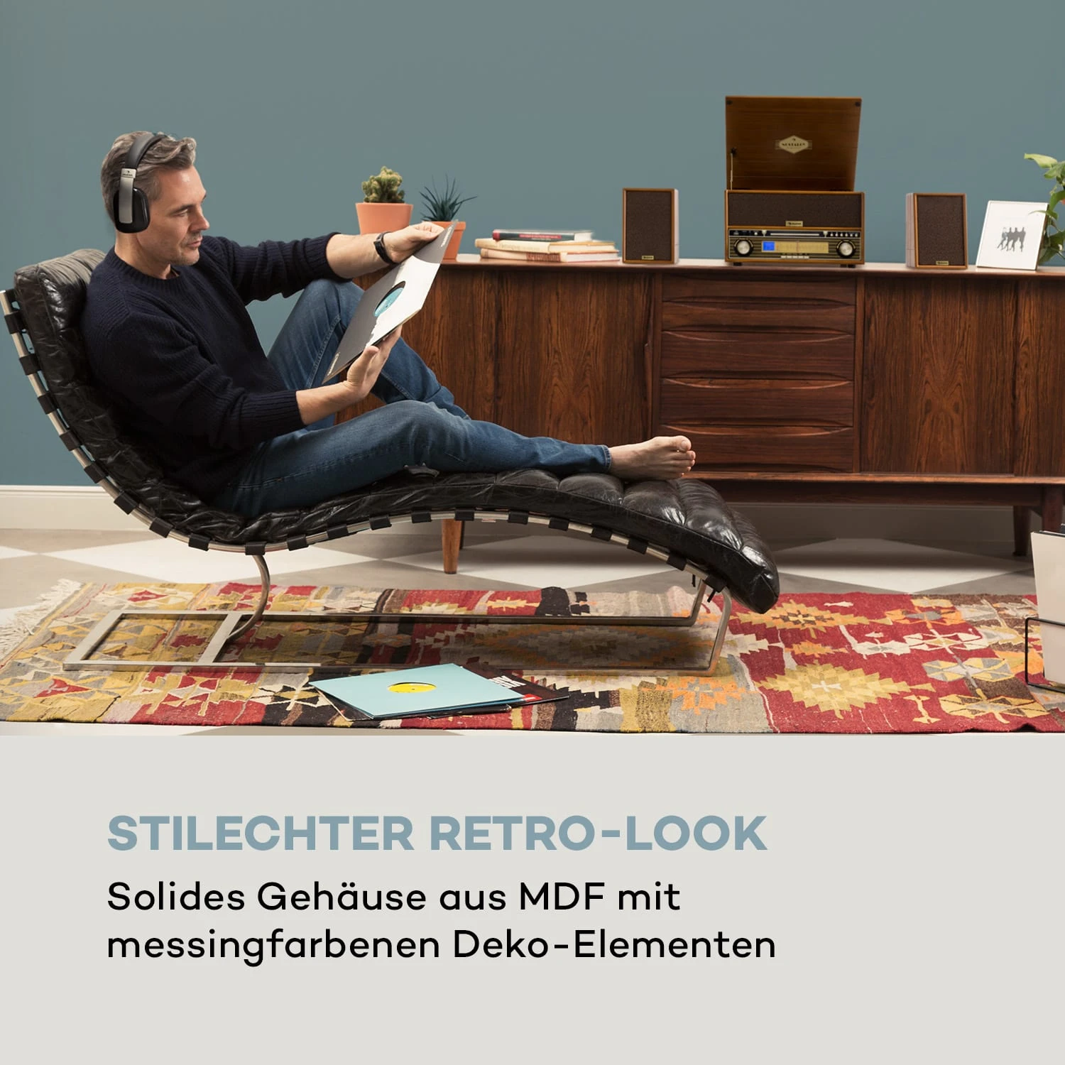 Neben dem schwungvollen Gehäuse aus solidem MDF unterstreichen messingfarbene Deko-Elemente die nostalgische Anmutung und machen die Retro-Stereoanlage Belle Epoque 1910 von auna zu einem Blickfang in jedem Wohnzimmer.