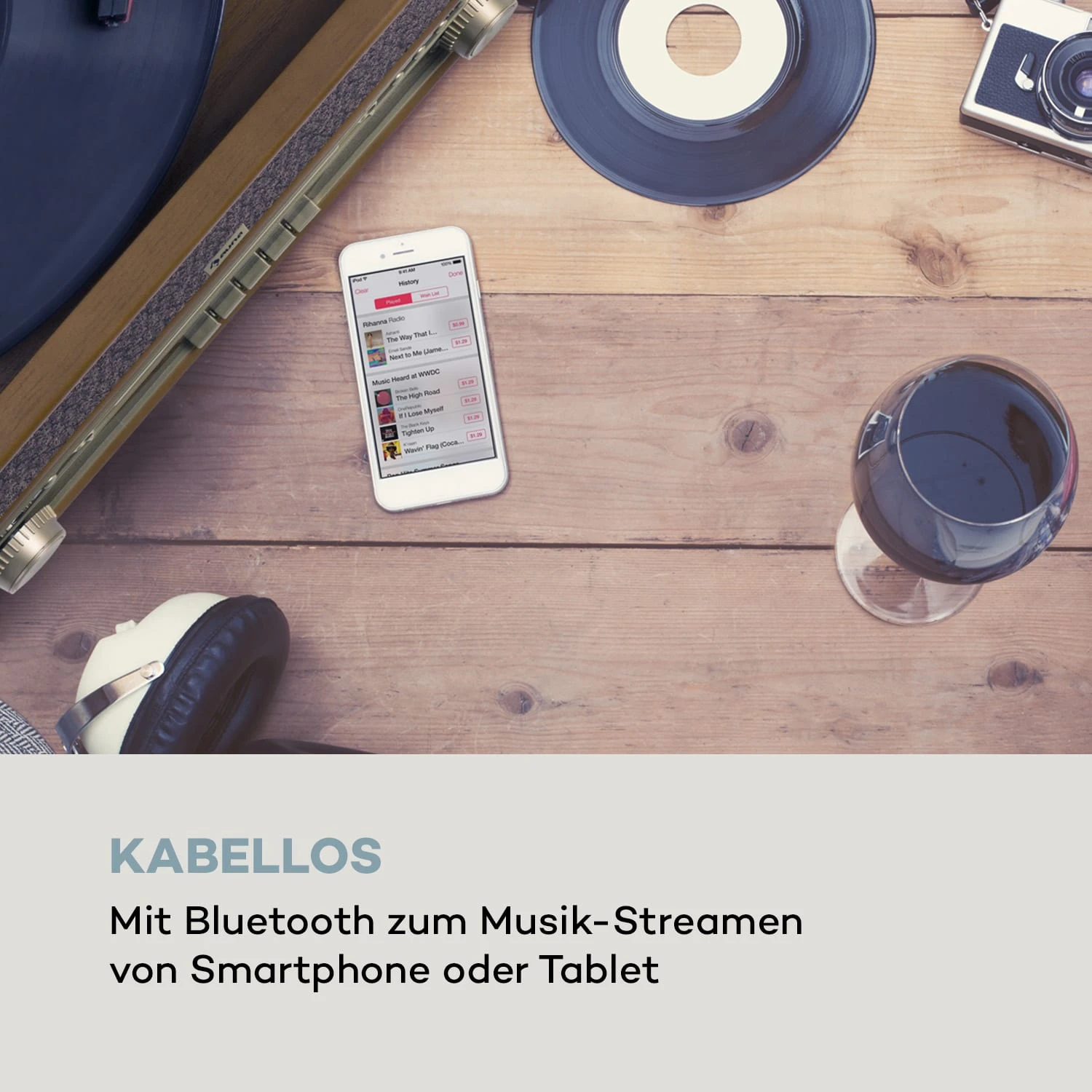 Um auch aktuelle Wiedergabemedien zu bedienen, verfügt das auna Retro-Musiksystem über eine MP3-fähige USB-Schnittstelle und einen SD-Card-Slot. Der Bluetooth-Empfänger ermöglicht das kabellose Musik-Streamen vom Smartphone, Tablet oder PC. Das unauffällig verbaute CD-Laufwerk liest die gängigsten Disc-Typen und rundet den Funktionsumfang sinnvoll ab.