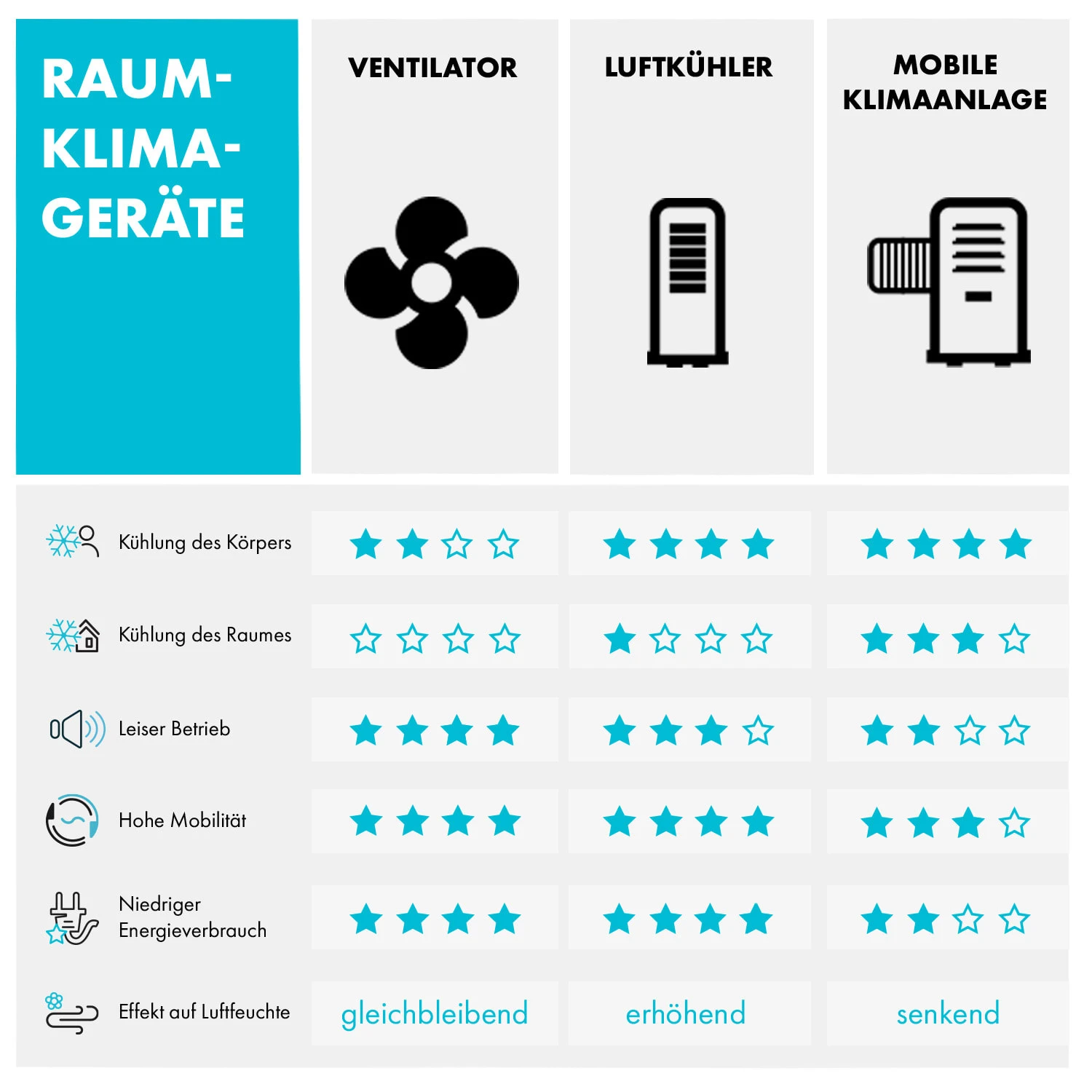 Als reiner Ventilator versetzt der Carribean Blue in drei Geschwindigkeitsstufen seine Lamellen in horizontale oder vertikale Schwingung und erzeugt selbst dann noch einen erfrischenden Hauch, wenn überall sonst die Luft buchstäblich steht. Auf diese Weise bewegt das Gerät bis zu 400 m³ Luft in einer Stunde. Wird nun noch die Kühlungsfunktion hinzugeschaltet, beginnt der Luftkühler Wasser aus seinem 4 Liter Tank zu verdunsten, das dabei die vorbeigeleitete Luft merklich abkühlt. Dieser Prozess basiert auf rein physikalischen Prinzipien und kommt daher ohne Kühlmittel und mit einem sehr geringen Energiebedarf von nur 70 Watt aus. Um die Kühlleistung nochmals zu erhöhen, können die im Lieferumfang enthaltenen Eispacks gefroren und dem Wassertank hinzugefügt werden – oder sie geben einfach Eiswürfel mit in den Wassertank. Das macht den oneConcept Carribean Blue als Luftbefeuchter auch im Winter zum willkommenen Helfer, der kontinuiierlich trockene Heizungsluft befeuchtet und so für eine Erleichterung bei geplagten Schleimhäuten sorgt. Voll mobil folgt dir der 3-in-1 Luftkühler dank Bodenrollen an jeden Einsatzort um punktgenau zu erfrischen: Egal ob am Schreibtisch, auf der Couch oder beim Kochen in der Küche.