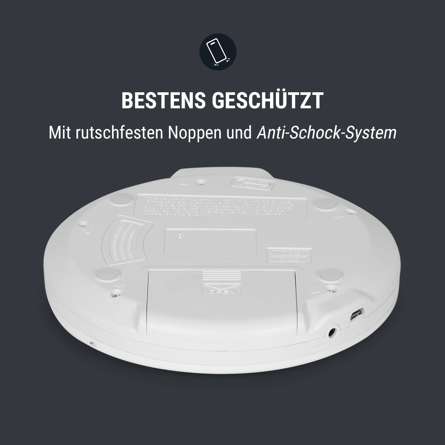 Der CD-Player hat einen Schockschutz, um die Unterbrechung der CD-Wiedergabe bei Erschütterungen zu verhindern. So kann man auch bei holprigen Unternehmungen sicher sein, dass die Musik unterbrechungsfrei weiterläuft. Dem Gerät liegen InEar-Kopfhörer bei, dem Musikgenuss steht also nichts mehr im Wege.