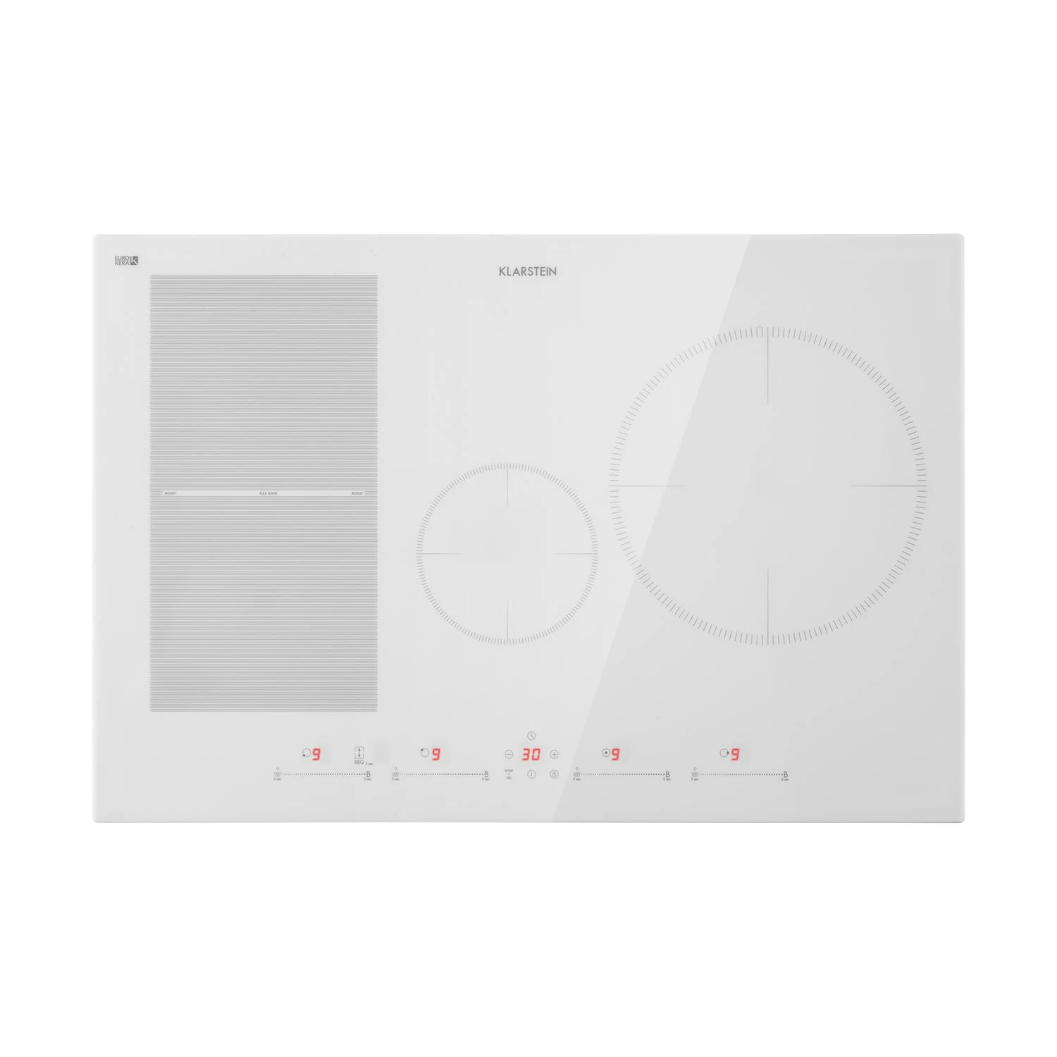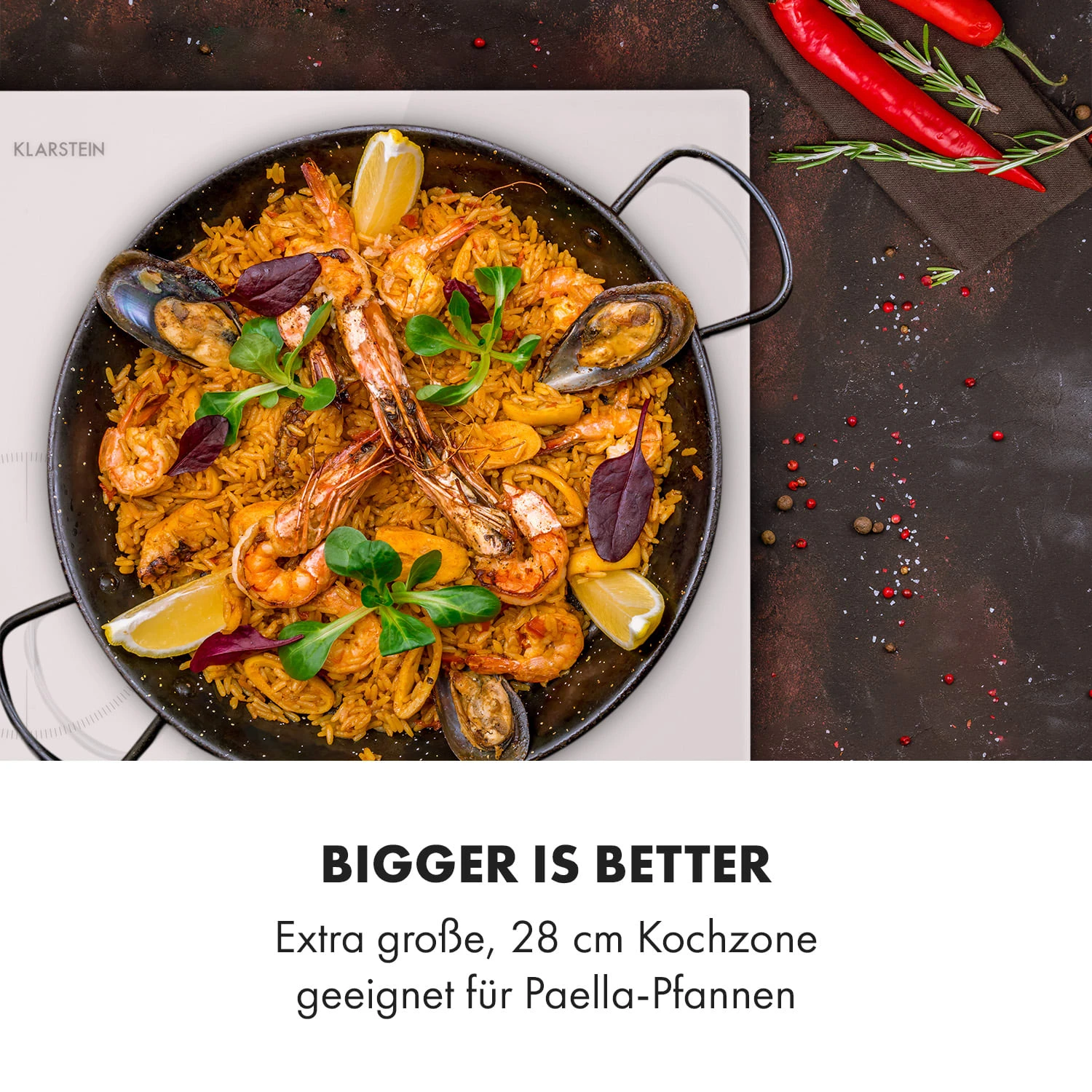Vier Kochflächen für den Genuss bietet das Klarstein Delicatessa 77 Hybrid Einbaukochfeld bei einer Gesamtleistung von max. 7000 Watt, die sich mit 2500, 2000 und 2 x 1500 Watt auf die einzelnen Kochflächen verteilen und die Inhalte von Töpfen und Pfannen in Spitzenzeiten zum Kochen bringen. Dabei vereinen sich per VarioHeating die beiden linken Kochzonen zu einer Flexzone: Mit maximaler Flexibilität passt sie sich dank Topferkennung an die Größe der darauf gesetzten Töpfe, Pfannen oder Kasserolen an und erhitzt so auch großes Kochgeschirr, das nicht auf ein einzelnes Kochfeld passt. Damit verbraucht die Delicatessa 77 Hybrid zum einen wirklich nur die Energie, die für den Topf passend ist und ermöglicht zum anderen die Nutzung fast jeder Topf- oder Pfannengröße. Auch an Freunde großer Pfannengerichte, wie Paellas, wurde bei der Delicatessa 77 Hybrid gedacht. Ihre rechte Kochzone durchmisst glatte 28 cm und bietet so spielend auch den ganz großen Pfannen den nötigen Platz. Alle Einzelfelder sowie das Flexfeld lassen sich separat in ihrer Leistung regeln und verfügen über eine ThermoBoost-Funktion, mit der die Leistung zum schnellen Erhitzen nochmals auf bis zu 3500 Watt gesteigert wird. Bedient wird das Klarstein Delicatessa 77 Hybrid Glaskeramik-Kochfeld unkompliziert mit einem integrierten SenseControl Touch-Panel mit Touch-to-slide-Regler zur Leistungskontrolle und Digitaldisplay. So durchbrechen weder Knöpfe noch Regler die Oberfläche der Küchenzeile. Neben der Leistung kann für jedes Kochfeld ein bis zu 99-minütiger Timer programmiert werden, der entweder nach Ablauf der eingestellten Zeit die Kochplatte abschaltet oder ein akustisches Signal ertönen lässt.