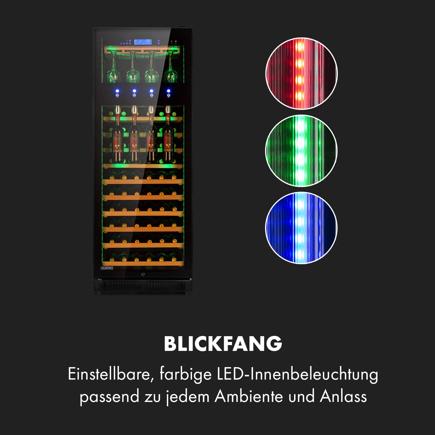 Das Auge trinkt mit: Für die gekonnte Präsentation der Weine sorgt die abschließbare, getönte Panoramaglastür mit schwarzem Rahmen. Die zuschaltbare, farbige Innenbeleuchtung setzt die gelagerten Flaschen zusätzlich passend zum Ambiente in Szene. Damit ist der Klarstein First Class 84 Weindispenser in Bars, Restaurants und auch auf Caterings oder Weinproben ein stilvoller Blickfang.