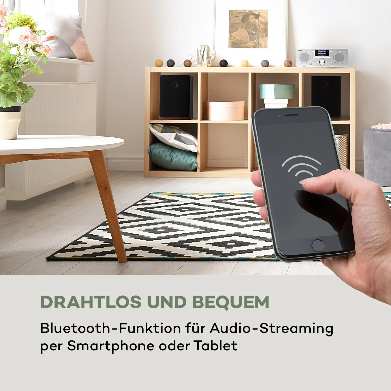 Ein Equalizer mit fünf Presets und die X-Bass-Funktion gehören zu den weiteren Merkmalen der Kompaktanlage. Die Bedienung erfolgt direkt am Gerät, bequem per Fernbedienung oder über WLAN per UNDOK-App von der Couch aus.