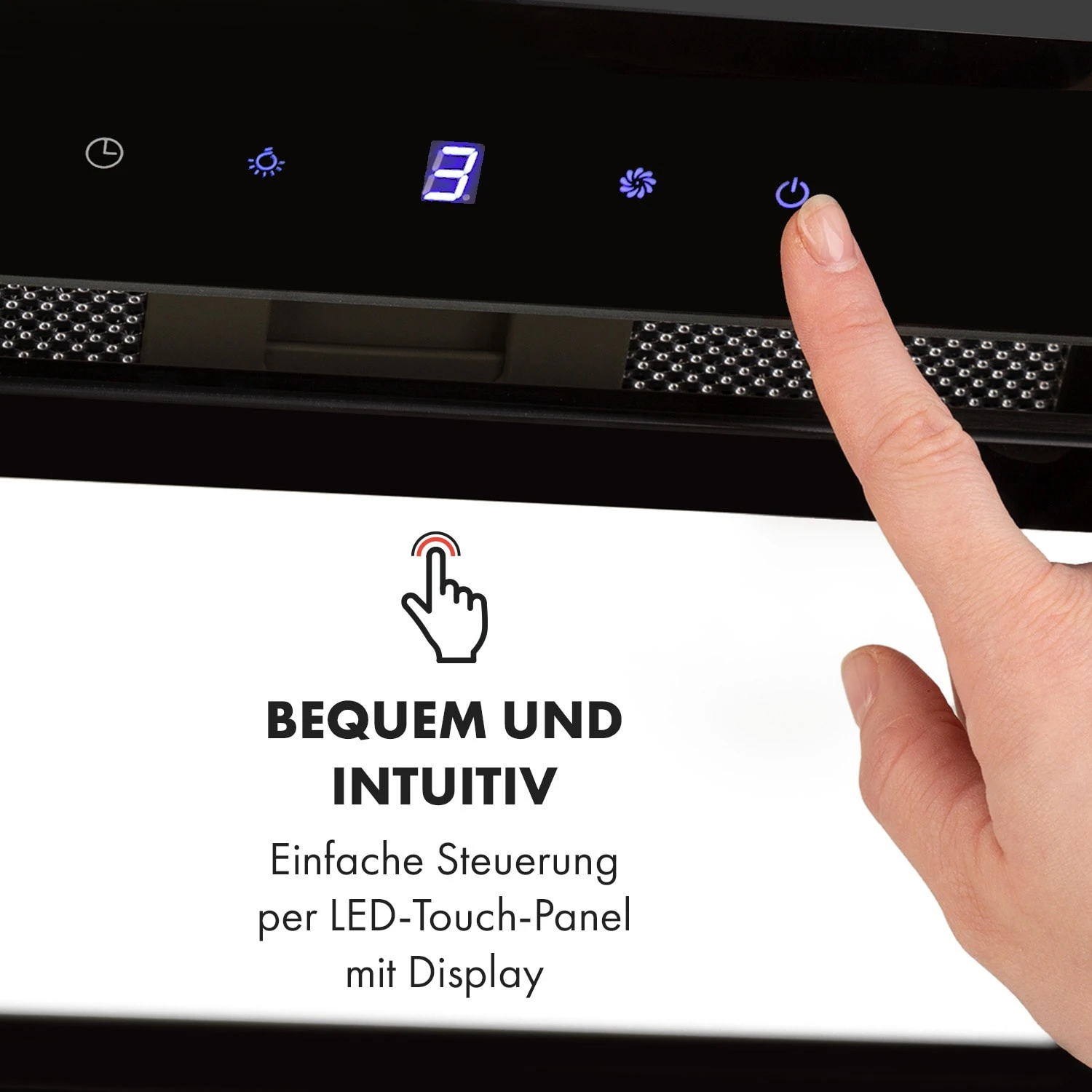 Der Klarstein Hektor Brilliant Edition Lüfterbaustein sorgt mit 200 Watt Motorleistung im Abluftbetrieb für dunstfreie Luft in deiner Küche. Strahlend hell wird es dabei über deinem Kochfeld durch das integrierte LED-Panel, das mit 6500 Kelvin Lichttemperatur Töpfe und Pfannen optimal ausleuchtet. Mit den drei Leistungsstufen und bis zu 506 m³/h Abluftleistung weht immer der passende Wind zum jeweiligen Kochaufkommen durch deine Küche. Der besondere Clou des Hektor Brilliant Edition Lüfterbausteins mit seinen 52 x 32 cm (BxT) ist seine Fähigkeit, so gut wie unsichtbar in deiner Küchenzeile zu werden. Anders als die meisten Einbauhauben verschwindet er randlos im Küchenhängeschrank über dem Herd und zeigt sich nur mit seiner edlen Unterseite aus Sicherheitsglas. Hier verbirgt sich auch das unkomplizierte Touch-Bedienfeld, mit der Lüftung, Beleuchtung und die Timer-Funktion gesteuert werden. Der Abschalt-Timer lüftet auf Wunsch für 1 bis 9 Minuten nach und schaltet das Gerät danach automatisch ab. Der eingebaute Fett-Filter lässt sich leicht ausbauen und ist einfach mit Wasser und etwas Spülmittel zu reinigen.