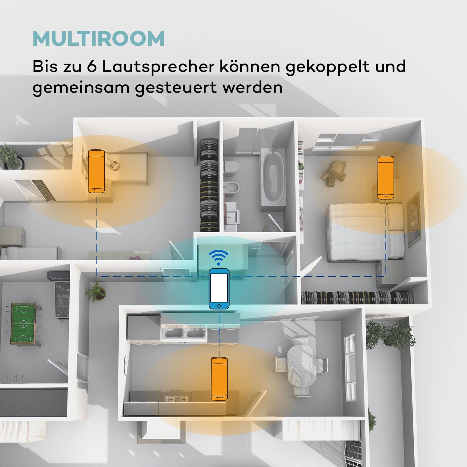 Per App-Control kann der auna Intelligence Tube Lautsprecher vom Smartphone, Tablet oder Notebook aus gesteuert werden. Das Multiroom-Features ermöglicht es zudem, bis zu 6 Intelligence Tube Lautsprecher zu koppeln. So können die Lautsprecher im Haus oder der Wohnung verteilt aufgestellt und mit nur einer App gesteuert werden. Da die Intelligence Tube nach IPX4-Standard spritzwassergeschützt ist, darf diese auch im Bad aufgestellt werden, sodass man beim Entspannen in der Badewanne seinen Lieblingshits lauschen kann.