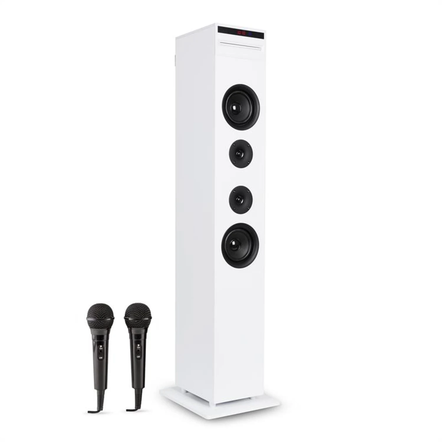 Der Karaoke-Turm nimmt beim Aufstellen kaum Platz ein und kann entweder auf vier gummierten Füßen oder einer hölzernen Bodenplatte stehen. So kann der Karaoke-Turm perfekt platziert werden.