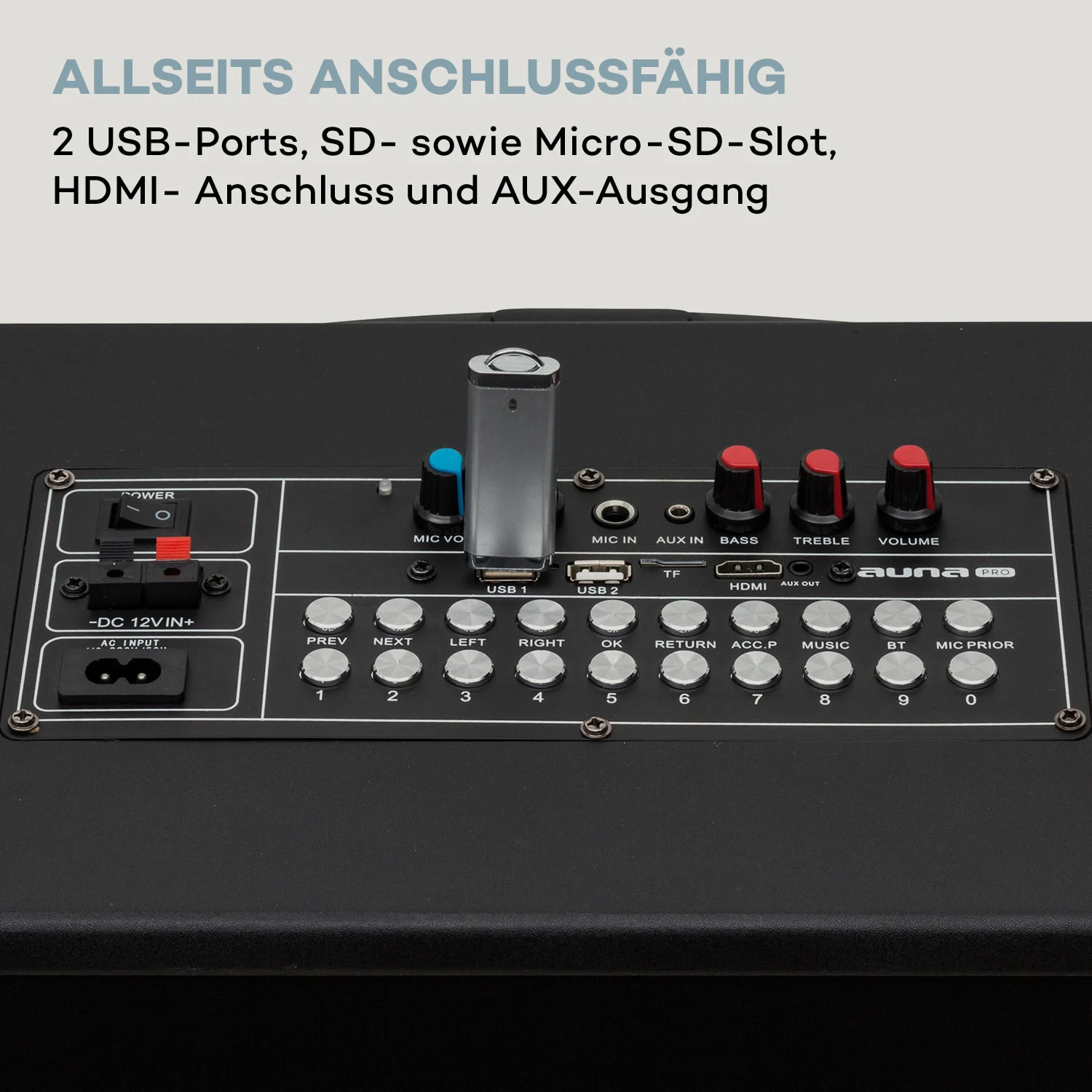 Mit Hilfe der integrierten WiFi-Schnittstelle und des 12,1″ (30,5 cm) großen Touch-Displays können zahlreiche Browser- und App-Anwendungen sowohl bildlich als auch hörbar über die auna KTV M Karaoke-Anlage wiedergegeben werden. Somit ist das Gerät perfekt für das Abspielen von YouTube-Videos, die Auswahl von Titeln in Spotify sowie das Ablesen von Lyrics geeignet. Der leistungsstarke 10″ (25,5 cm) Subwoofer versorgt das Umfeld mit drückenden Bässen, die unter die Haut gehen, während der 3″ (7,5 cm) Hochtöner das Klangbild abrundet. Vielfältige Anschlussmöglichkeiten liefern den gewünschten Sound: Entweder per Bluetooth-Verbindung von Smartphone, Tablet oder MP3-Player, über 2 USB-Ports, SD- oder Micro-SD-Slot sowie per HDMI-Kabel. Ein AUX-Ausgang leitet das Audio-Signal zudem zu weiteren Audio-HiFi-Geräten wie Stereo-Anlagen weiter. Über den Mic-Eingang kann natürlich auch eine E-Gitarre klangstark Zugang finden. Für heiße Karaoke-Auftritte, mitreißende Gesangsdarbietungen und fetzige Moderationen sorgen die beiden kabellosen UHF-Funk-Mikrofone: Ungebunden glänzen sie mit störungsfreier Übertragung – perfekt, um jedem Publikum richtig einzuheizen. Auch für den mobilen Einsatz auf Veranstaltungen ist das auna KTV M Karaoke-System bestens gerüstet: Das robuste Gehäuse hält vielen Belastungen stand, während der verlängerte Trolleygriff auch großen DJs das bequeme Ziehen der Anlage ermöglicht. Ein leistungsstarker 12 V / 4,5 mAh Akku sorgt für 3 bis 5 Stunden Dauerbetrieb, wobei das mitgelieferte Netzkabel einen problemlosen Anschluss an das Stromnetz ermöglicht. Eine vollwertige Fernbedienung ermöglicht die Steuerung auch über einige Distanz hinweg.