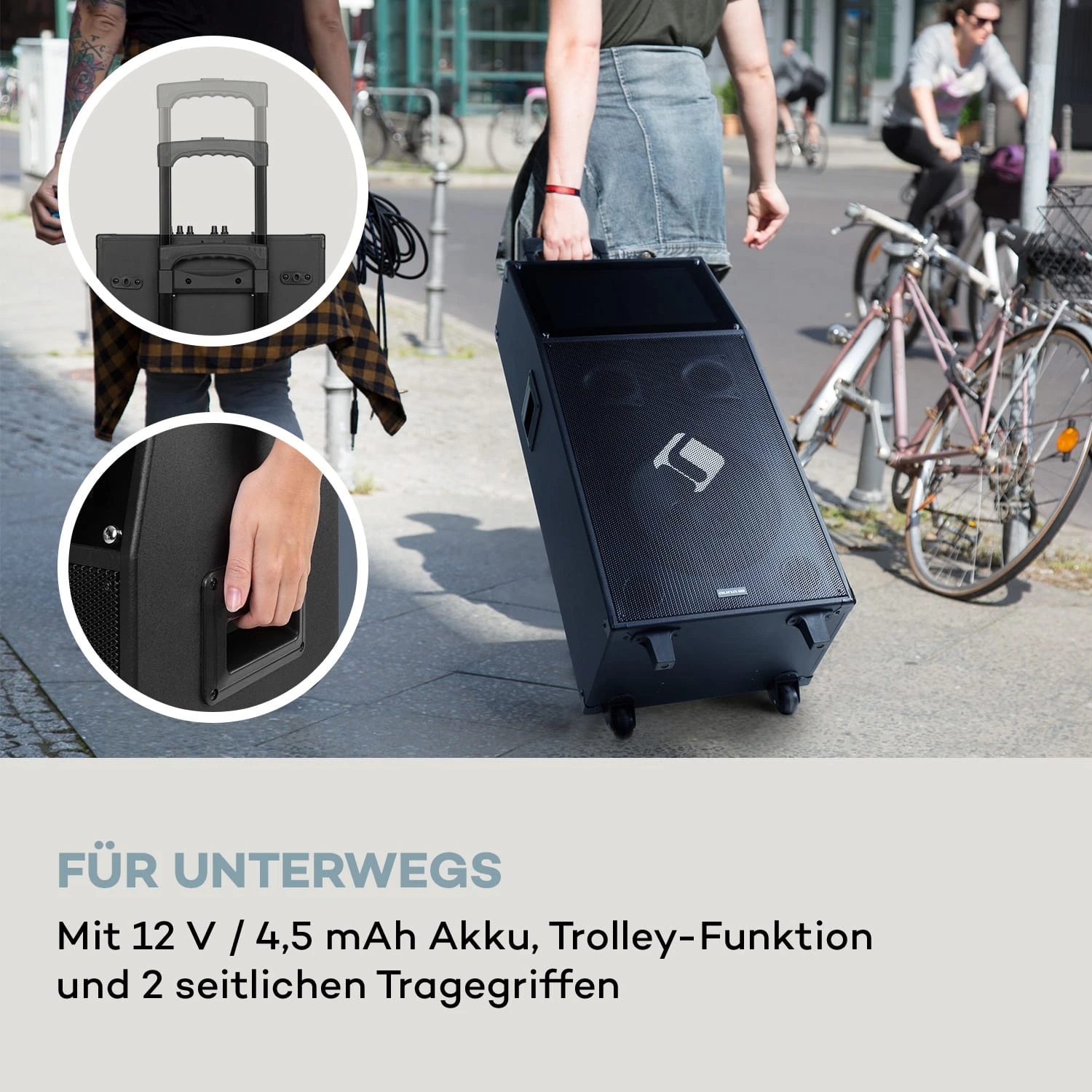 Das auna KTV M Karaoke-System ist dank Trolley-Funktion, einem großen Touch-Display, 2 drahtlosen UHF-Mikrofonen und einem langlebigen 12 V / 4,5 mAh Akku das ideale Gerät für alle Karaoke-Liebhaber.