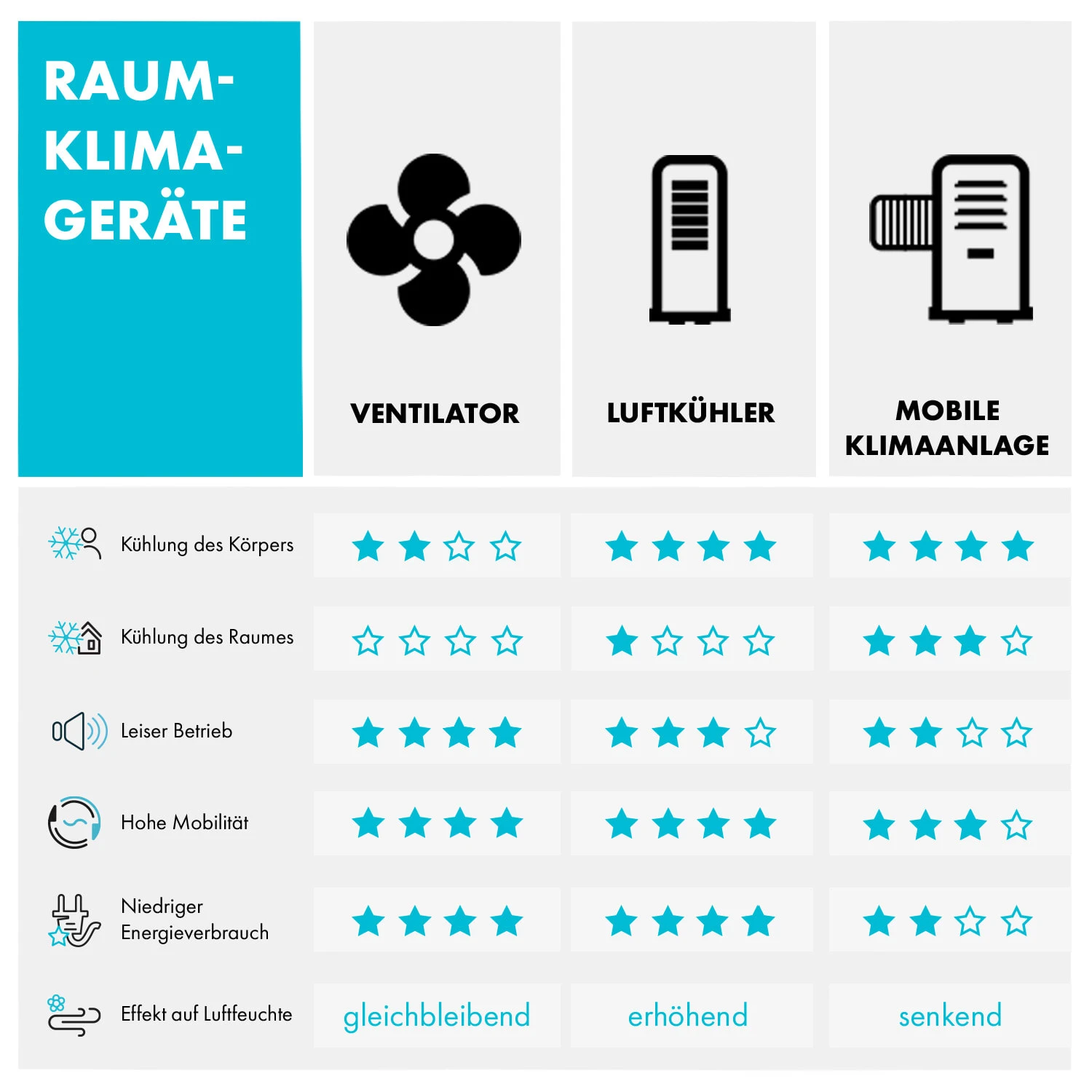- 4 Betriebsmodi (Kühlung, Luftentfeuchtung, Ventilation und Automatik)