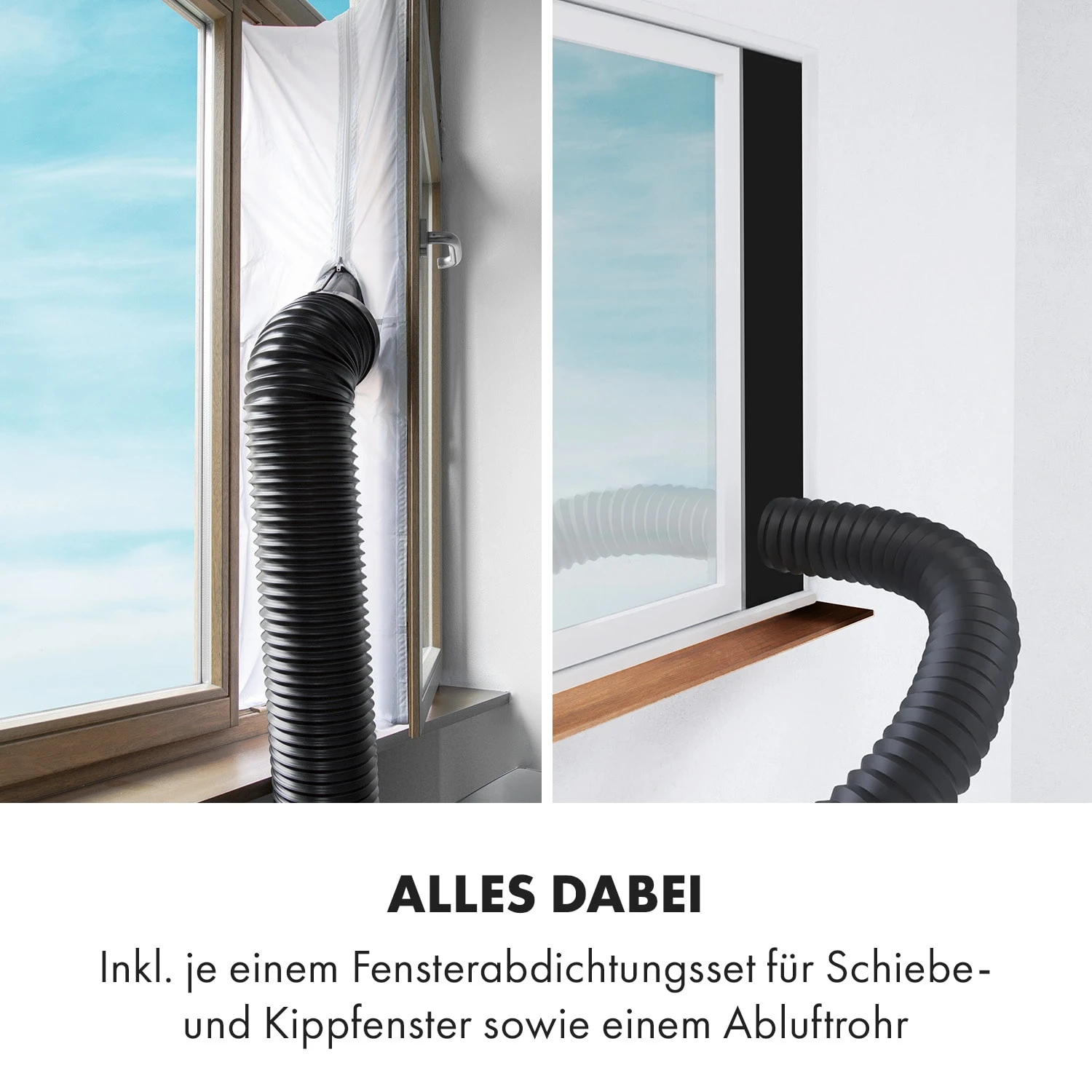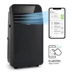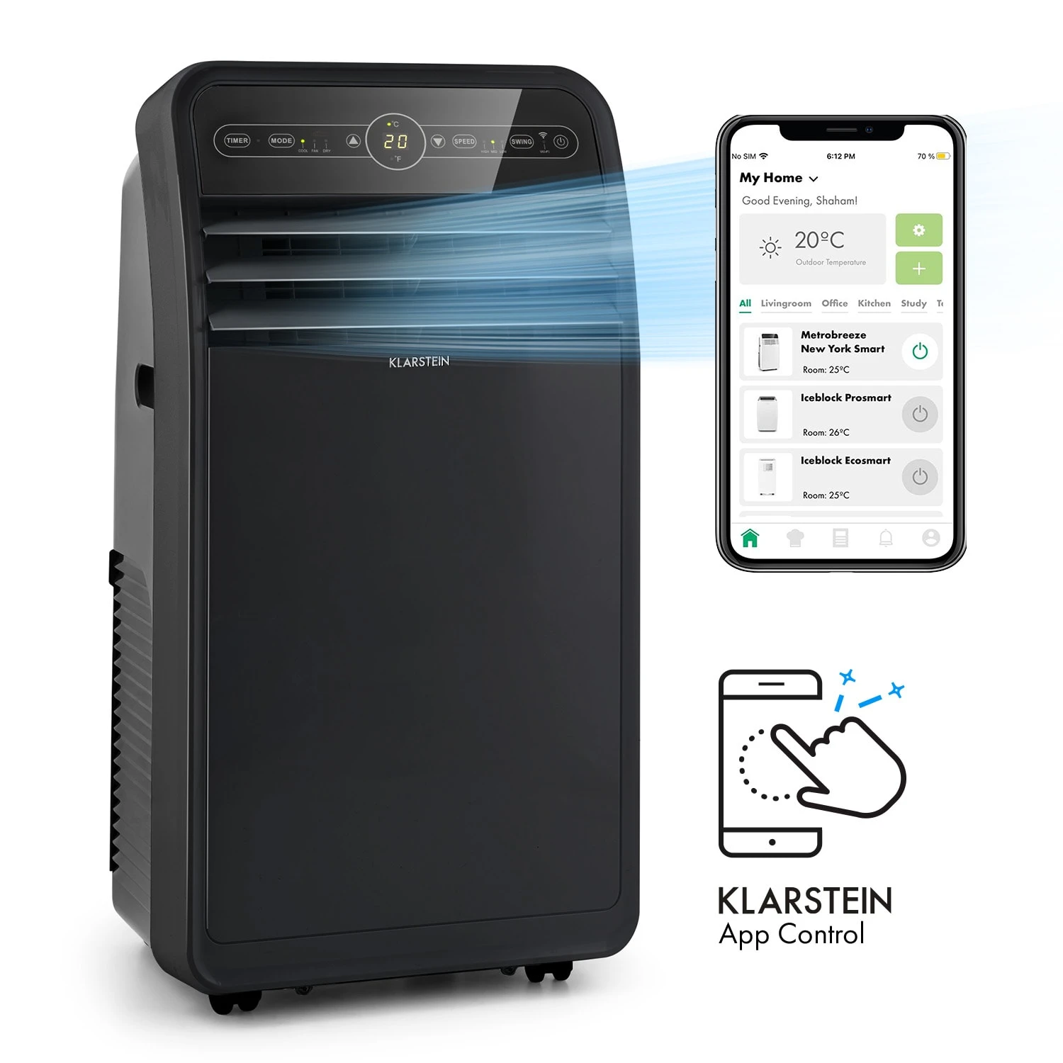 Die Klarstein Metrobreeze New York Smart 12k mobile Klimaanlage sorgt für klare, kühle Raumluft an heißen Sommertagen und verbessert mit Ventilator und Luftentfeuchter zugleich das Raumklima. Dabei trumpft das Gerät mit einem leistungsstarken, aber dennoch sparsamen Kompressor zur Luftkühlung auf. 12000 BTU bzw. entsprechende 3,5 kW tragen dem Metrobreeze New York Smart 12k die Energieeffizienzklasse A ein und machen ihn zum geeigneten Dauerbetriebsgerät für Räume von 35 bis 59 m² Größe. Dank der Klarstein-App kannst du die Klimaanlage auf Rollen bequem per Smartphone steuern und im Raum eine Zieltemperatur zwischen 17 und 30 °C erreichen. Die 24-h-Timer-Funktion rundet den Komfort perfekt ab und im Lieferumfang ist zudem eine Abdichtungsset für Schiebe- und Kippfenster enthalten.