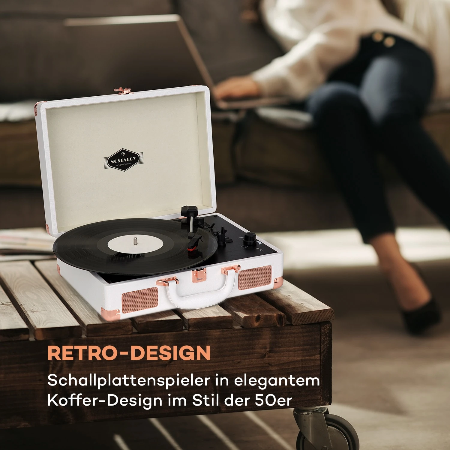 Besonderer Hingucker: Der Peggy Sue Plattenspieler kommt in einem robusten MDF-Design-Koffer mit Kunstleder-Bespannung, Beschlägen in Roségold -Optik, Klippverschluss und Tragegriff. Damit macht er nicht nur optisch eine umwerfende Figur im Retro-Look, sondern kann auch ganz leicht überall mit hingenommen werden – z.B. zum stimmigen Nostalgie-Picknick im Garten.