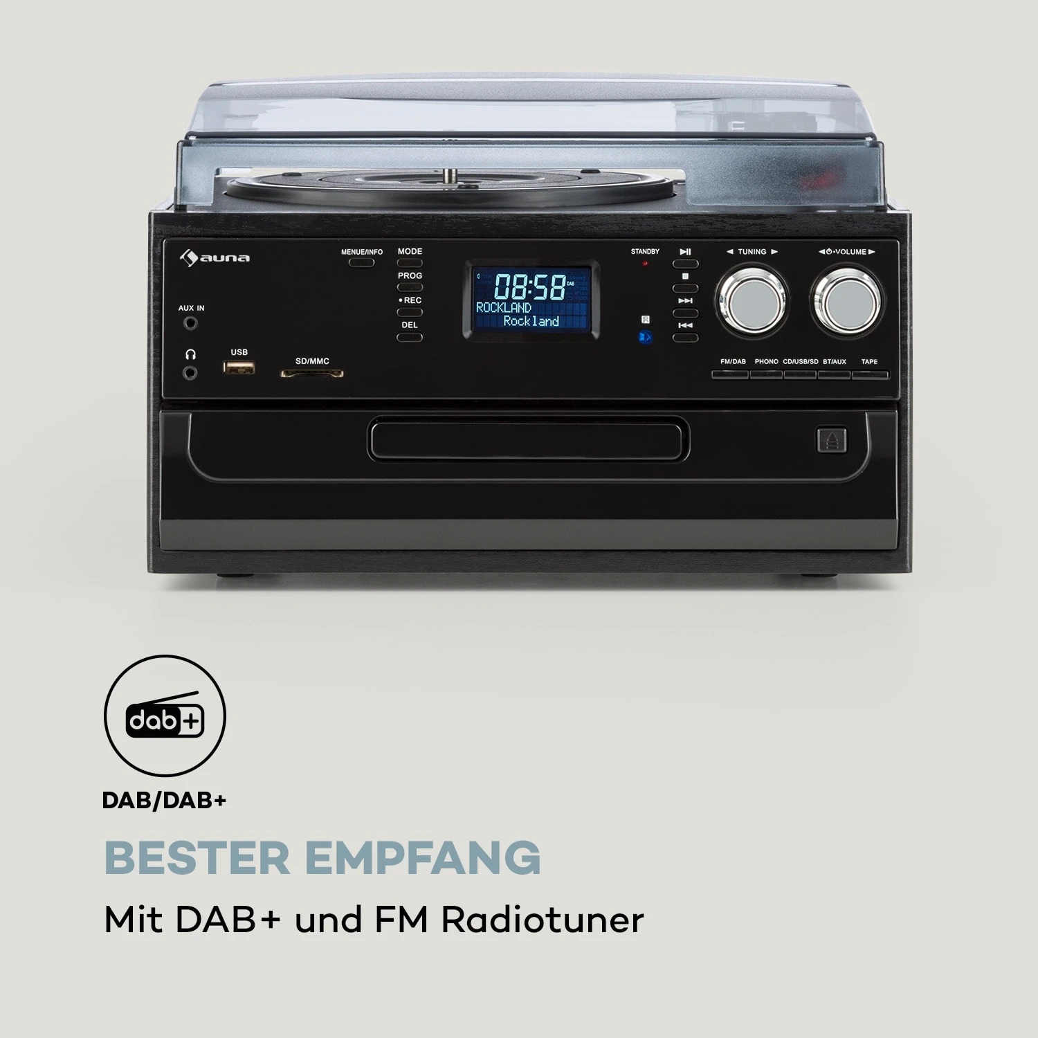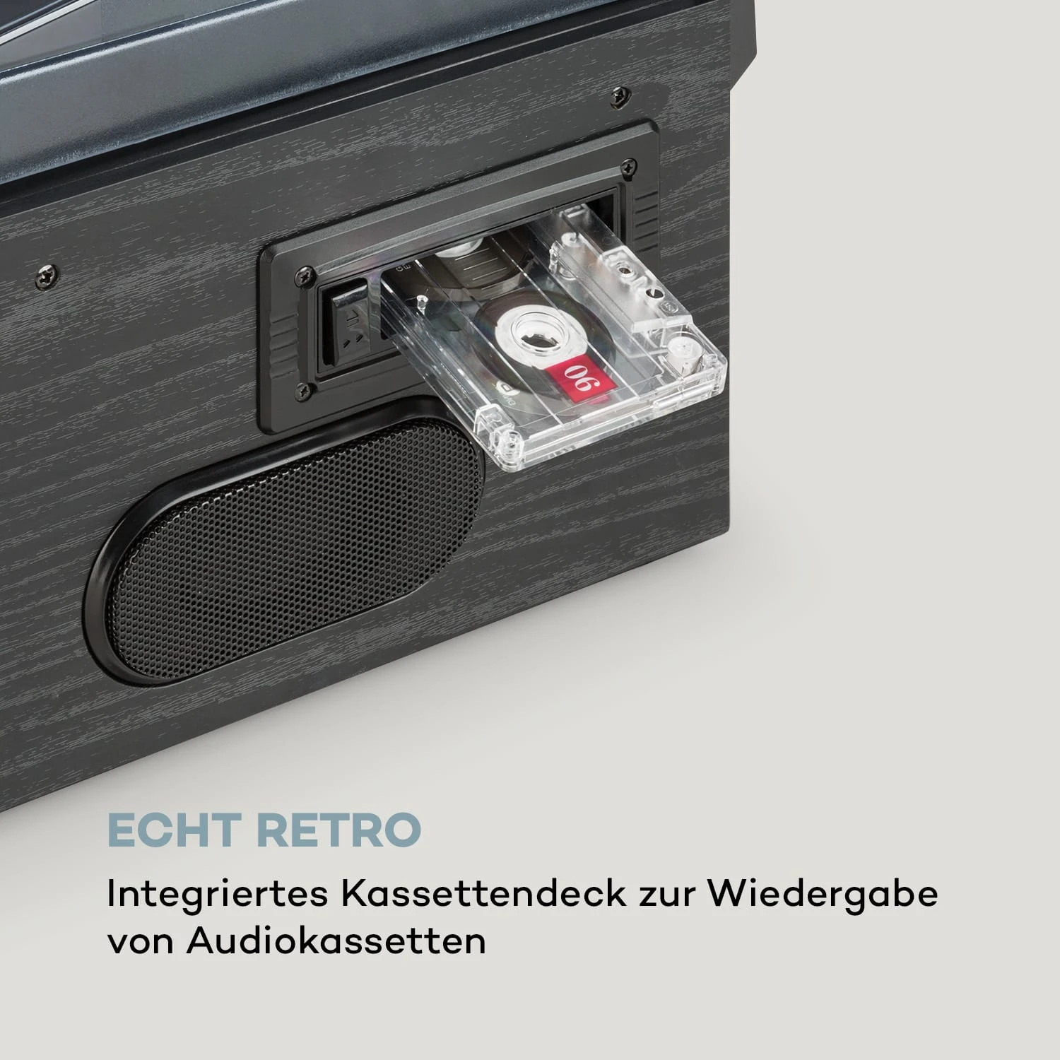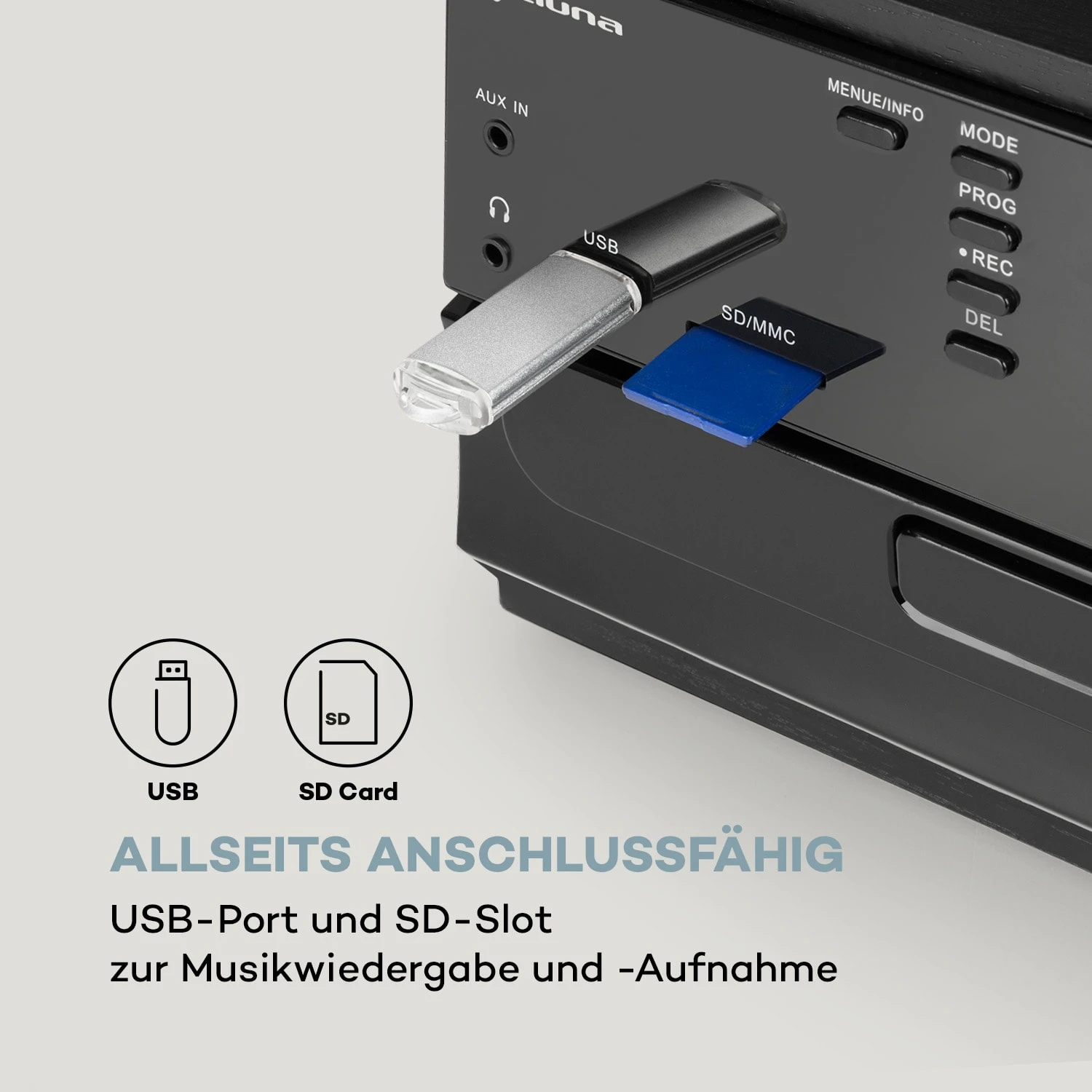 Den Mittelpunkt der Retro-Stereoanlage bildet der unter einem Schutzdeckel verborgene Plattenspieler, der zusammen mit dem seitlich verbauten Kassettendeck und dem MP3-fähigen CD-Player alle musikalischen Leitmedien seit dem frühen 20. Jahrhundert abdeckt. Ein Plattenspieler mit einem Riemenantrieb und drei Geschwindigkeiten von 33, 45 & 78 Umdrehungen pro Minute hält die auna-Stereoanlage somit ebenso in der täglichen Rotation, wie Kassetten und CD-Medien. Seine Anschlussfähigkeit an moderne Mediengewohnheiten bezeugt das Gerät mit frontseitig verbauten USB- und SD-Anschlüssen, mit deren Hilfe die Tonspuren von Kassette, CD oder Platte ohne viel Aufhebens direkt als MP3-Datei auf USB- bzw. SD-Datenträgern aufgezeichnet werden können. Auf dem Weg in die Zukunft begegnet man einem FM/DAB+ Radiotuner, der neben lokalen Signalen auch digitale Sender in hoher Klangqualität und ohne Rauschunterbrechungen empfängt. Vollkommen in der Moderne angekommen fühlt man sich jedoch erst mit der Bluetooth-Funktion, durch die sämtliche Audio-Dateien von Smartphone oder Tablet drahtlos und bequem über die auna Oakland DAB Retro-Stereoanlage wiedergegeben werden können. Dank ihrer vielen Funktionen und integrierten Lautsprechern erweist sich die auna Oakland DAB Retro-Stereoanlage als überaus platzsparende HiFi-Komplettlösung, die sich gerade auch in Wohnbereichen mit beschränktem Platzangebot wohlfühlt. Die integrierten Stereo-Lautsprecher der auna-Mikroanlage zeichnen dabei ein aussagekräftiges Klangbild, das sich über den Line-Ausgang Rückendeckung bei einem externen HiFi-Verstärker holt.