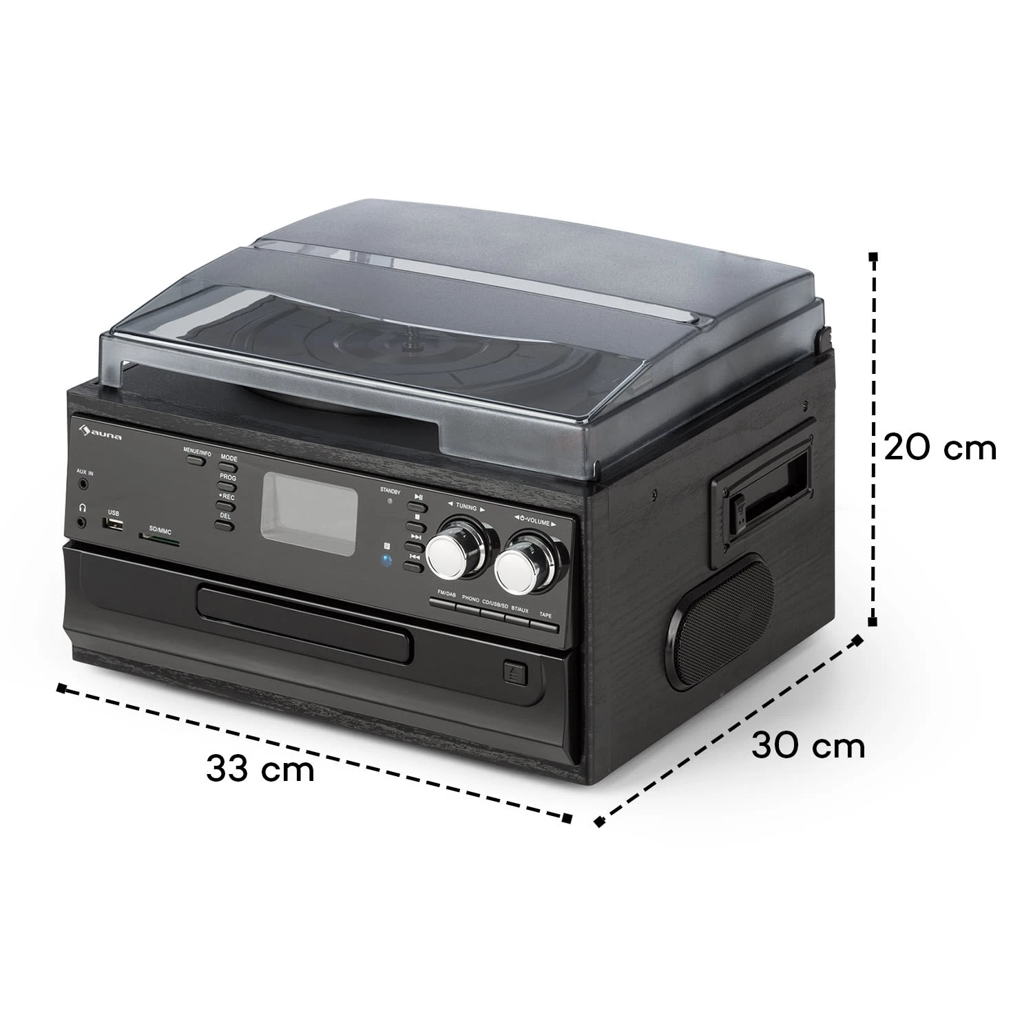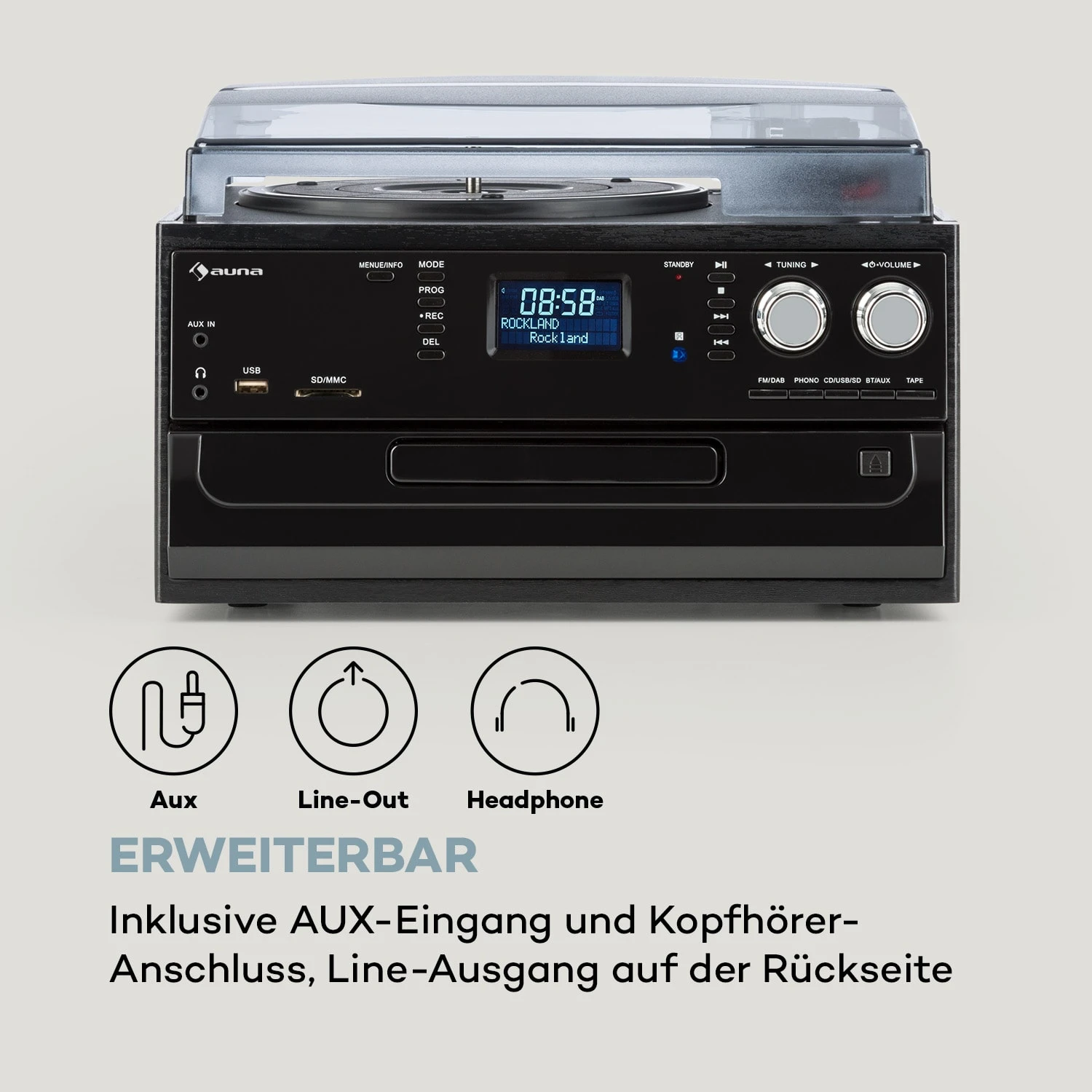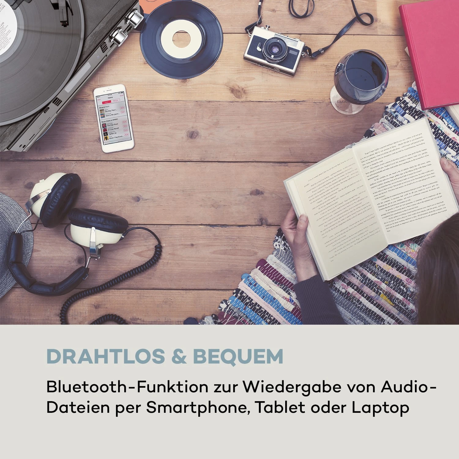 Den Mittelpunkt der Retro-Stereoanlage bildet der unter einem Schutzdeckel verborgene Plattenspieler, der zusammen mit dem seitlich verbauten Kassettendeck und dem MP3-fähigen CD-Player alle musikalischen Leitmedien seit dem frühen 20. Jahrhundert abdeckt. Ein Plattenspieler mit einem Riemenantrieb und drei Geschwindigkeiten von 33, 45 & 78 Umdrehungen pro Minute hält die auna-Stereoanlage somit ebenso in der täglichen Rotation, wie Kassetten und CD-Medien. Seine Anschlussfähigkeit an moderne Mediengewohnheiten bezeugt das Gerät mit frontseitig verbauten USB- und SD-Anschlüssen, mit deren Hilfe die Tonspuren von Kassette, CD oder Platte ohne viel Aufhebens direkt als MP3-Datei auf USB- bzw. SD-Datenträgern aufgezeichnet werden können. Auf dem Weg in die Zukunft begegnet man einem FM/DAB+ Radiotuner, der neben lokalen Signalen auch digitale Sender in hoher Klangqualität und ohne Rauschunterbrechungen empfängt. Vollkommen in der Moderne angekommen fühlt man sich jedoch erst mit der Bluetooth-Funktion, durch die sämtliche Audio-Dateien von Smartphone oder Tablet drahtlos und bequem über die auna Oakland DAB Retro-Stereoanlage wiedergegeben werden können. Dank ihrer vielen Funktionen und integrierten Lautsprechern erweist sich die auna Oakland DAB Retro-Stereoanlage als überaus platzsparende HiFi-Komplettlösung, die sich gerade auch in Wohnbereichen mit beschränktem Platzangebot wohlfühlt. Die integrierten Stereo-Lautsprecher der auna-Mikroanlage zeichnen dabei ein aussagekräftiges Klangbild, das sich über den Line-Ausgang Rückendeckung bei einem externen HiFi-Verstärker holt.