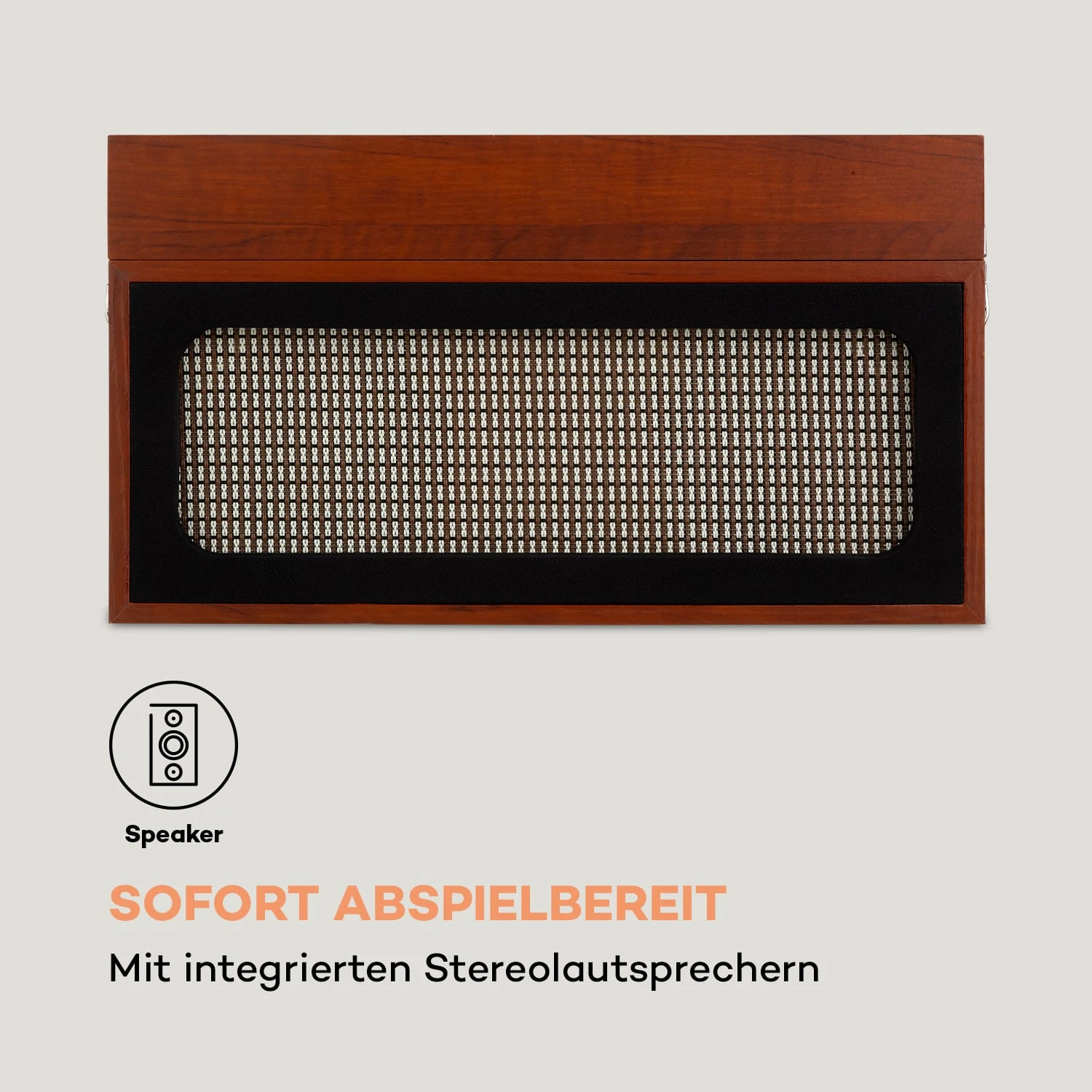 Der Plattenspieler ist sofort abspielbereit: In seinem kompakten Koffergehäuse sind die Stereolautsprecher bereits integriert. Über den rückseitigem Stereo-Cinch-Ausgang lassen sich zusätzlich externe Lautsprecher oder eine HiFi-Anlage anschließen. Die Lautstärke kann über den Drehregler im Innern des Plattenspielers stufenlos verstellt werden. Bis zu drei verschiedene Plattengrößen finden ihren Platz auf dem Plattenteller und drehen unermüdlich ihre Runden.
