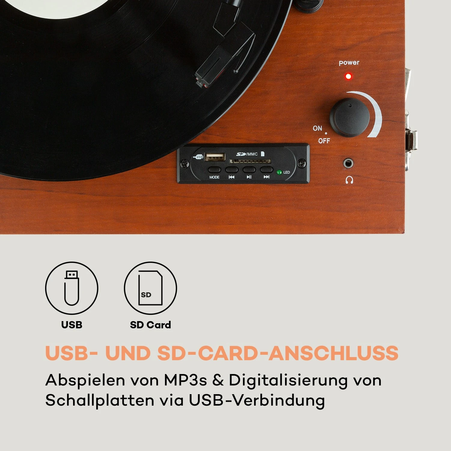 Außerdem ermöglicht der Plattenspieler das Aufnehmen und Konvertieren von Schallplatten in MP3s: Die umgewandelte Musik kann ganz einfach auf einem USB-Stick oder einer SD-Karte mithilfe des jeweiligen Anschlusses gespeichert werden. Doch damit nicht genug: Bluetooth im Sarah Ann Plattenspieler macht das Streamen vom Smartphone, Tablet oder PC möglich. Die Kopfhörer-Buchse erlaubt dabei jederzeit die diskrete und direkte Beschallung zu jeder Stunde. Ideal, wenn man den Abend mit dem atmosphärischen Knistern von Schallplatten ausklingen lassen möchte.