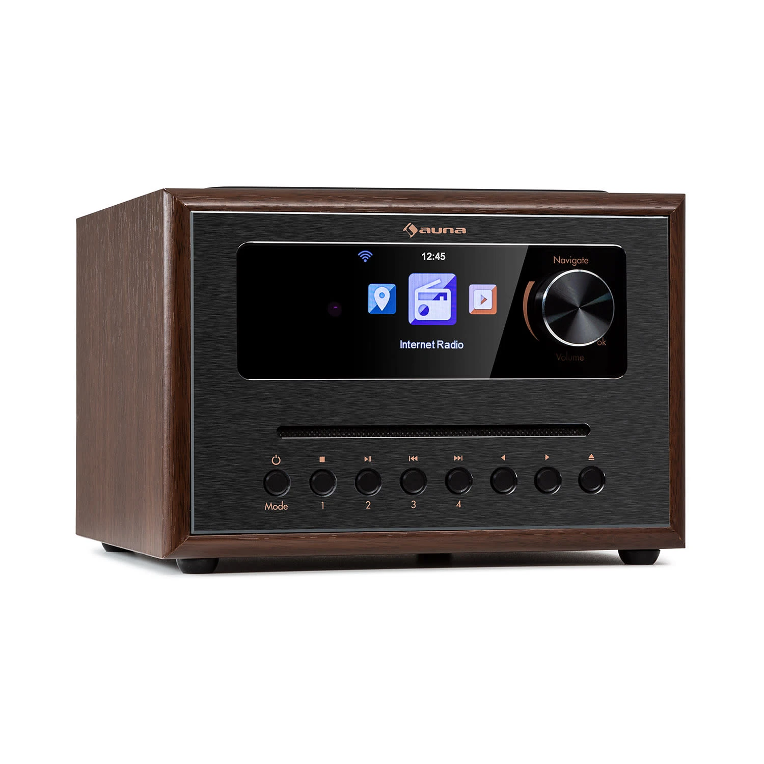 CD-Player mit WLAN-Internet-Radio und UKW-Tuner in edlem Gehäuse mit Frontpanel aus gebürstetem Aluminium.