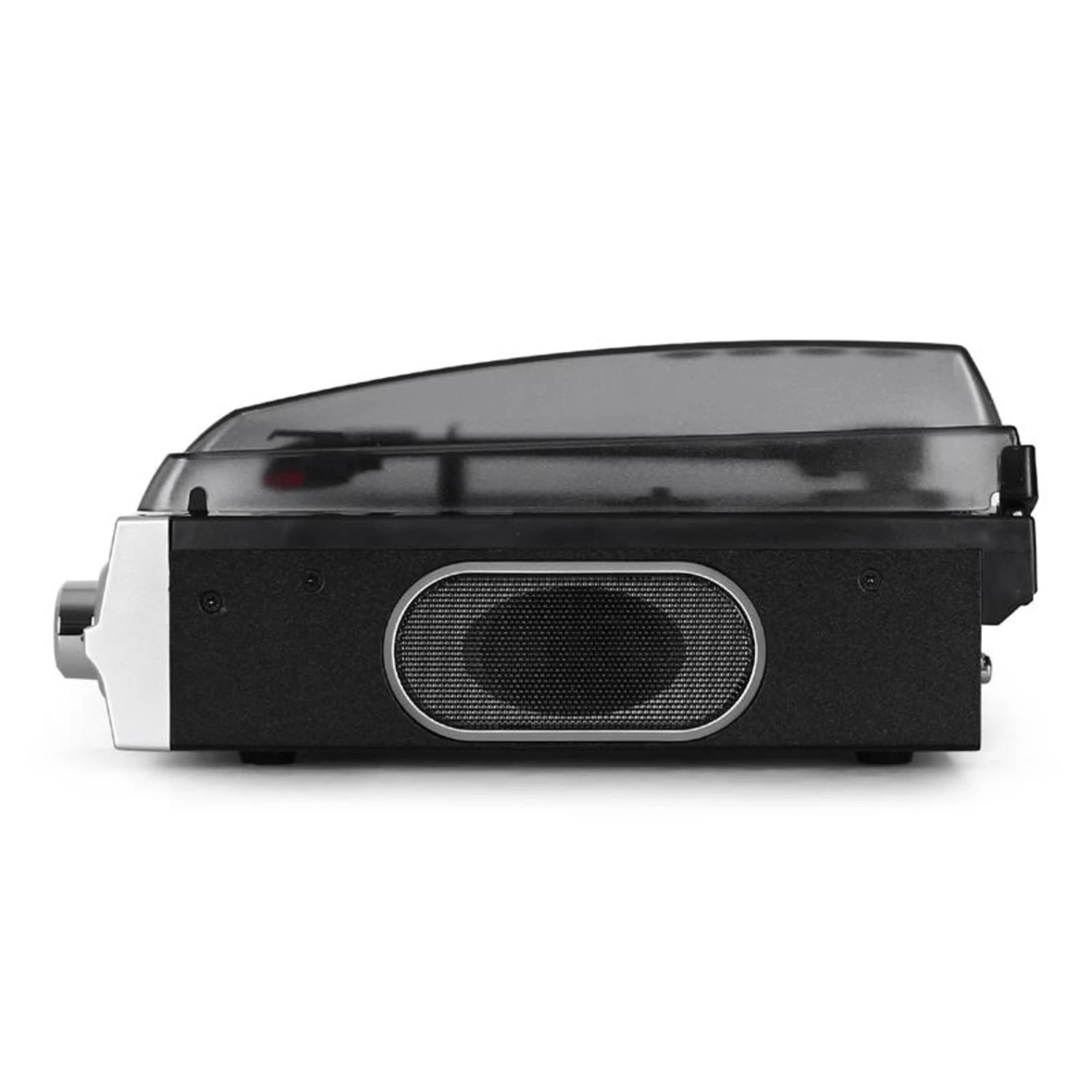 Dabei unterstützt er die herkömmlichen Wiedergabegeschwindigkeiten von 33 bis 45 U/min um unterschiedliche Schallplattengrößen abzudecken und ist mit einer praktischen Stopp-Automatik ausgestattet. Er benötigt keine zusätzlichen Lautsprecher, denn in seinem kompakten Gehäuse sind bereits zwei Lautsprecher verbaut. Die Lautstärke lässt sich dabei stufenlos direkt am Gerät einstellen. Damit dem ungetrübten Musikgenuss nichts im Wege steht, bietet der Kopfhörer-Anschluss eine weitere Möglichkeit der Beschallung. Für höhere Lautstärkepegel steht ein Line-Ausgang an der Rückseite bereit, der die Audiosignale an externe Verstärker, Mischpulte oder HiFi-Anlagen weiterleitet.