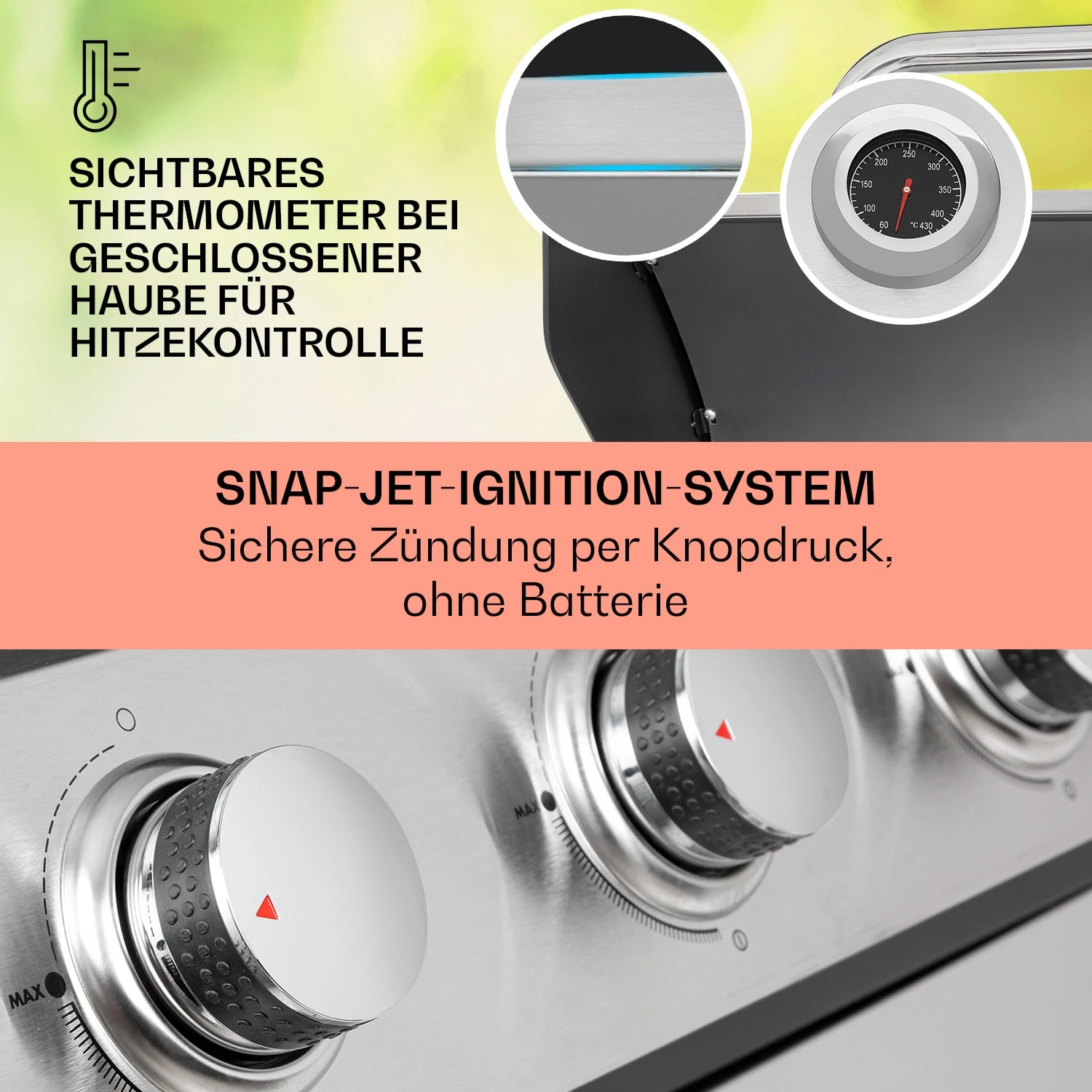 - doppelwandige Haube aus Edelstahl für indirektes Grillen