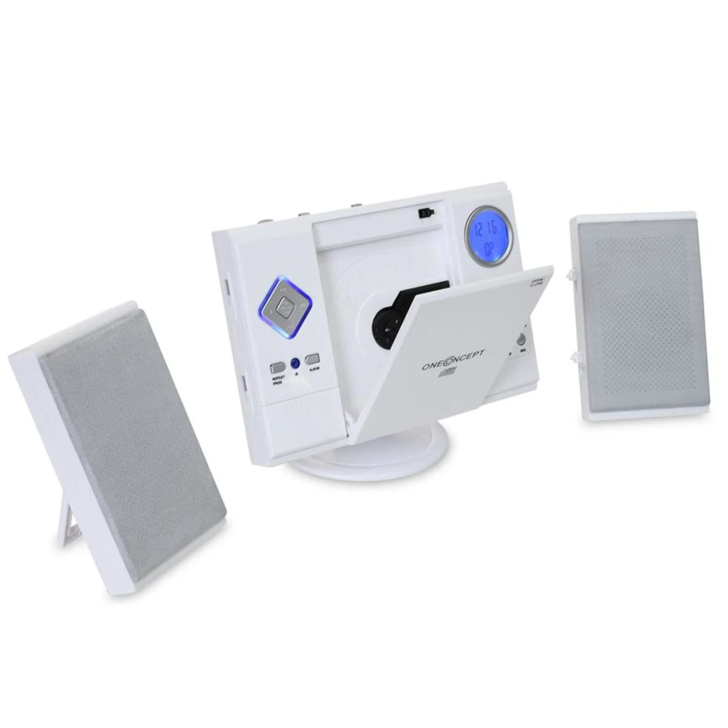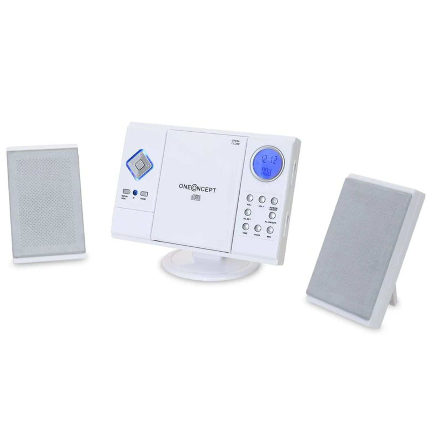 Im optischen Mittelpunkt der oneConcept V-12 ruht ein vertikal eingelassener, MP3-fähiger CD-Player. Abgerundet wird das Unterhaltungsrepertoire des Gerätes durch einen UKW/MW-Radioreceiver.